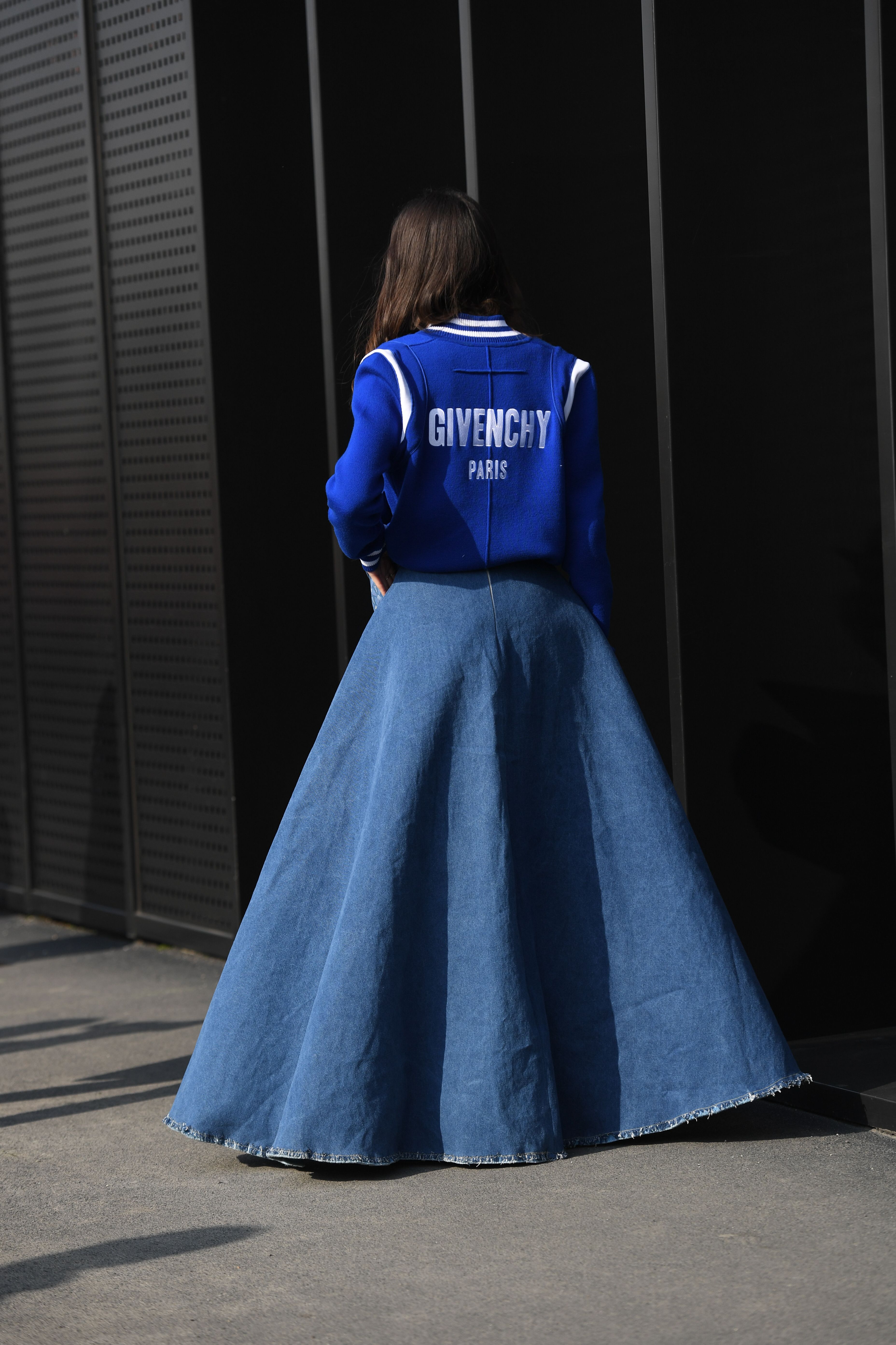A guest is seen in a Givenchy jacket and long denim skirt outside Milan Fashion Week.