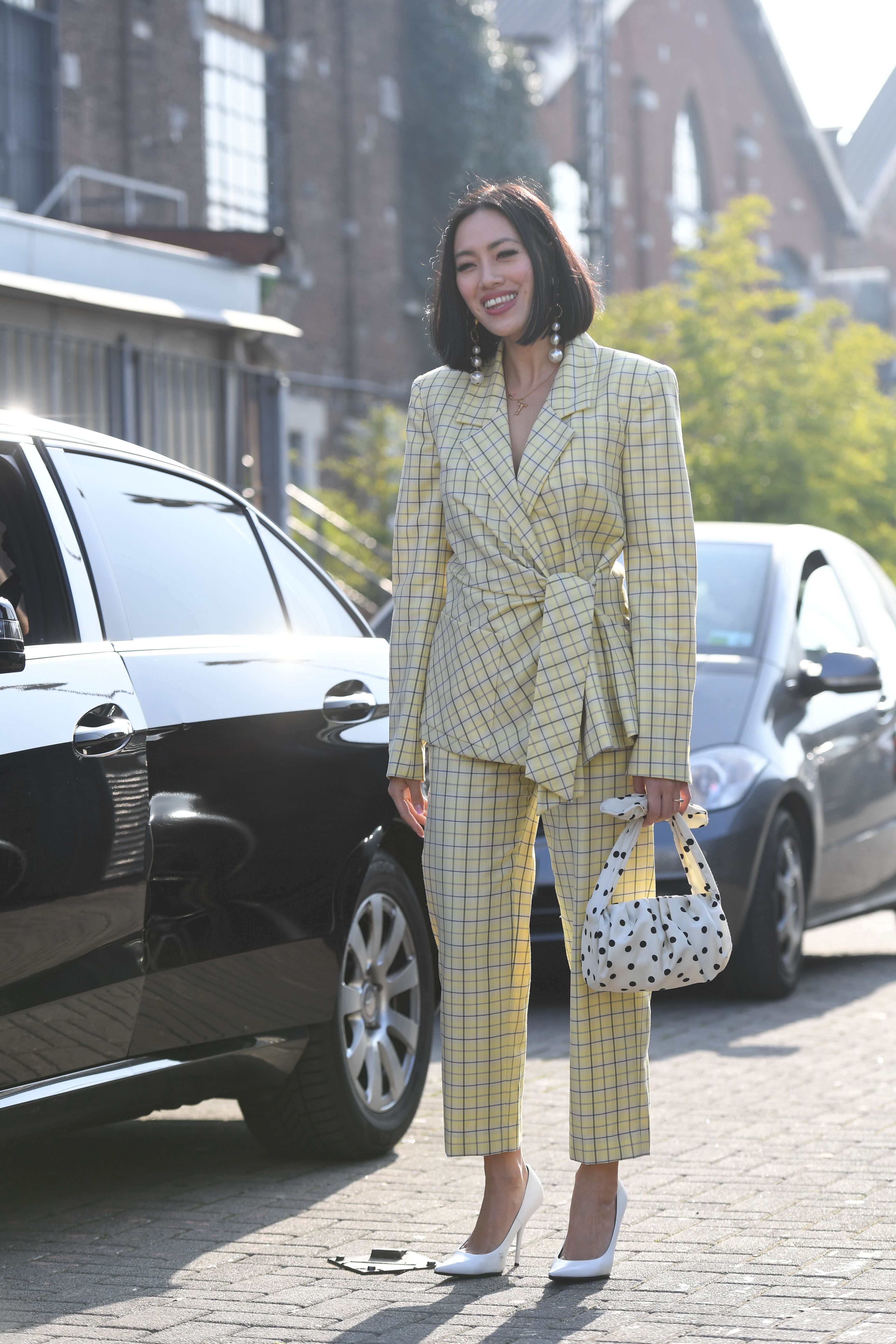 Fashion Buying Director for Mytheresa Tiffany Hsu wears a yellow plaid suit and carries a polka dot bag during Milan Fashion Week.