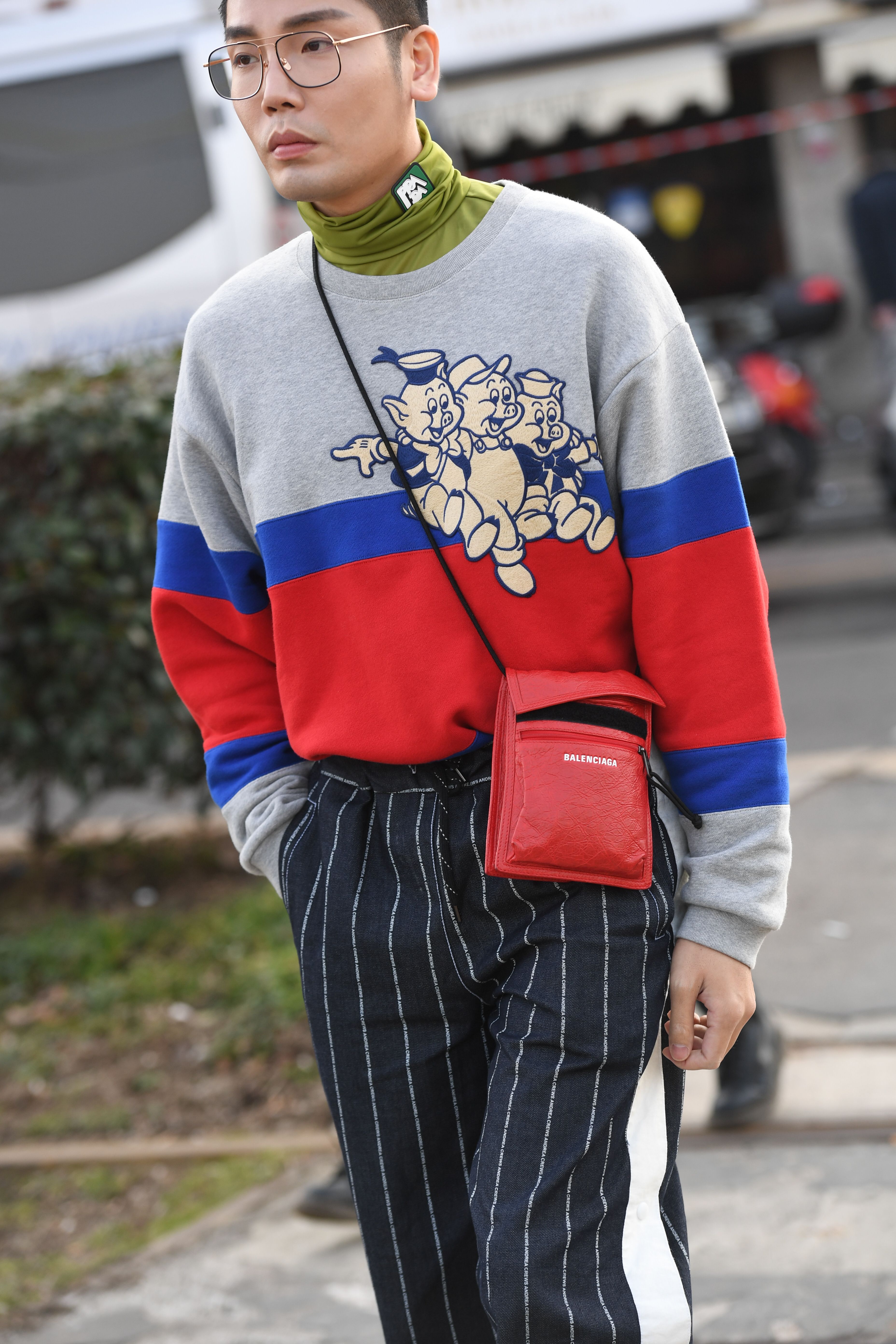 A guest wears a sweater featuring three cartoon pigs, carrying a Balenciaga bag outside Milan Fashion Week 2019.