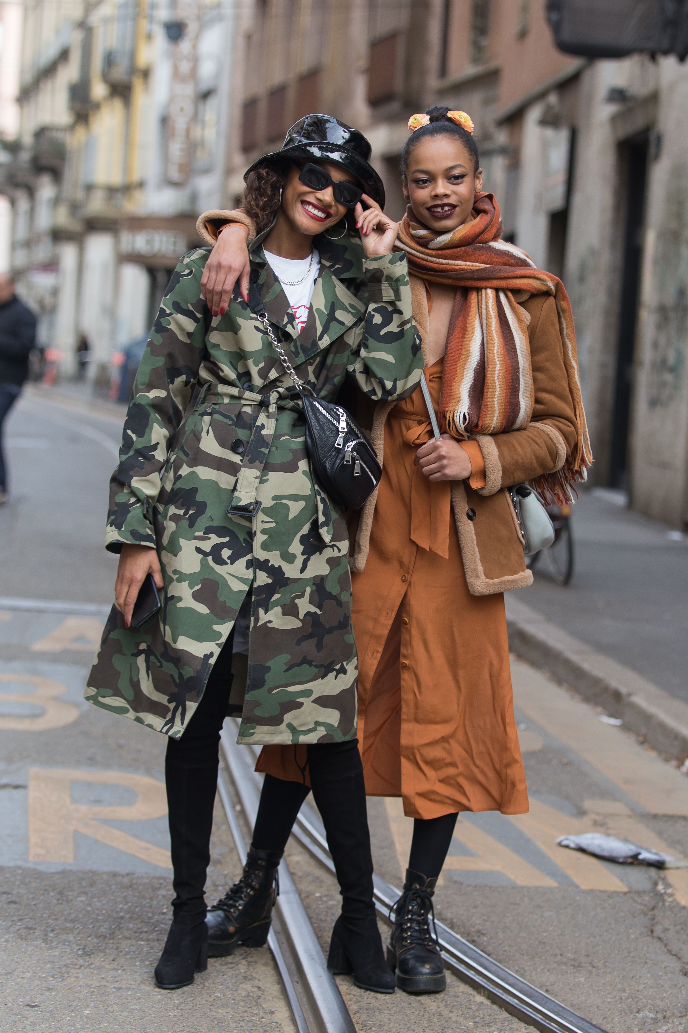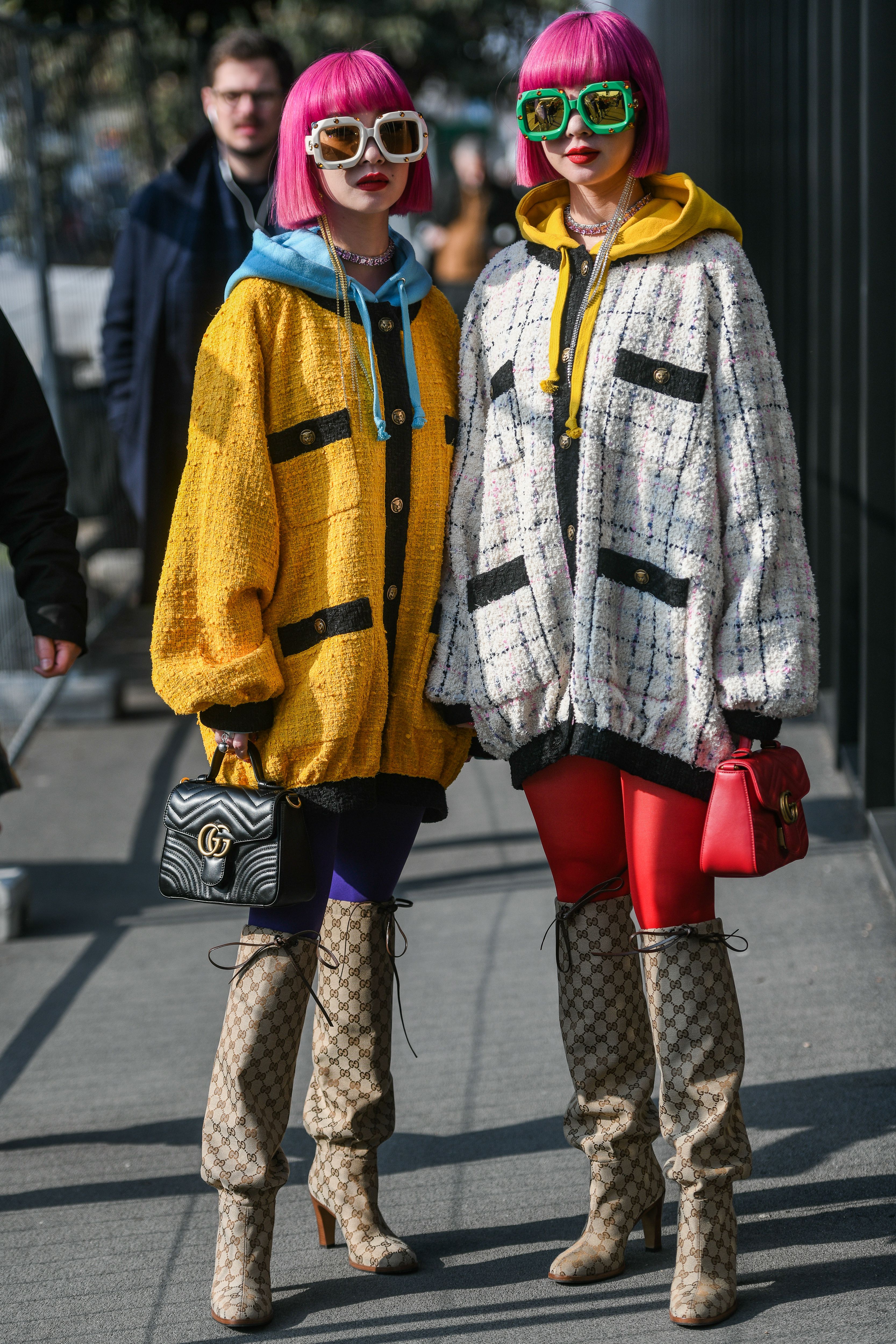 Sisters Ami Suzuki and Aya Suzuki wear wildly colorful ensembles outside Milan Fashion Week.
