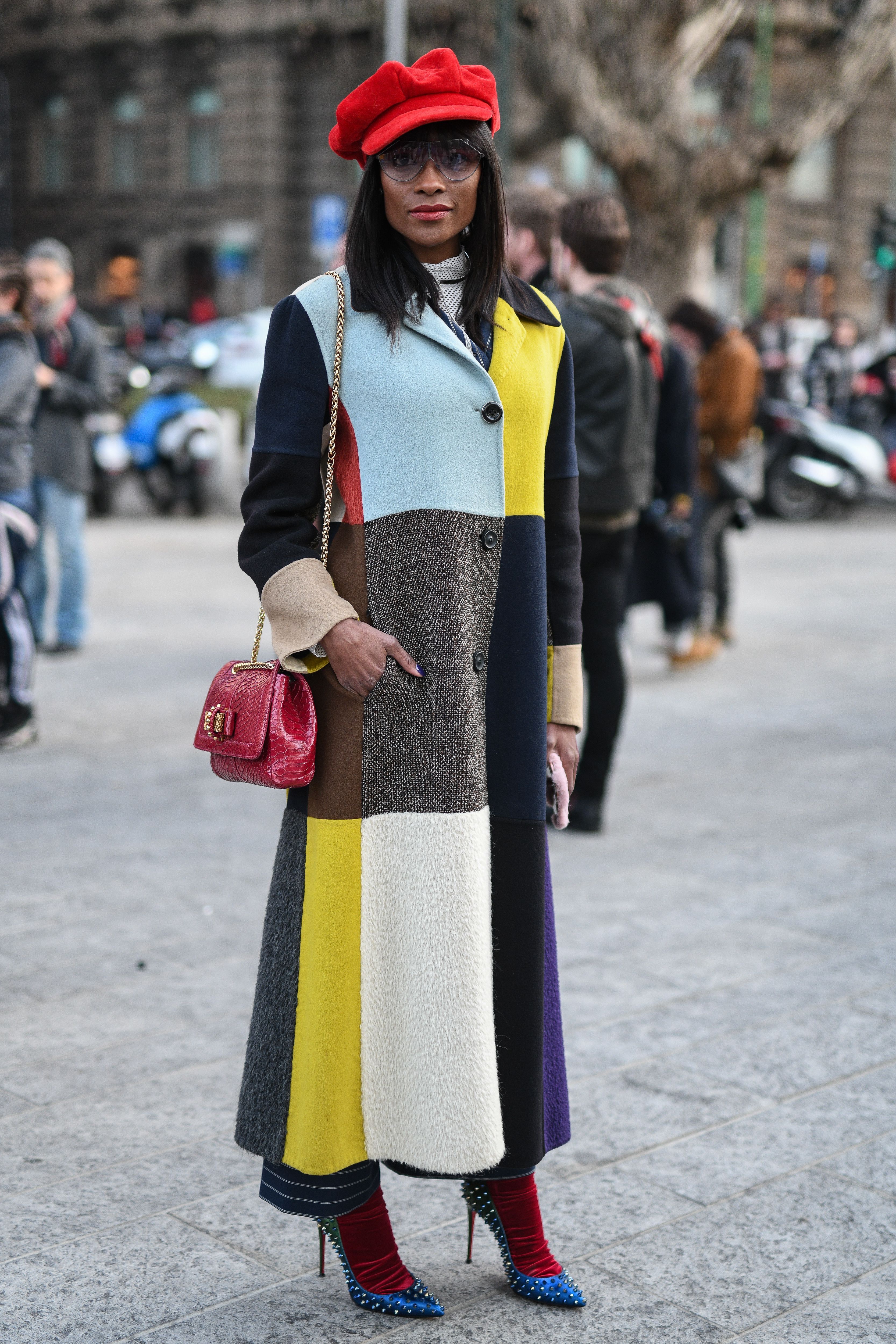 A guest wears a multi-colored patchwork coat and blue studded heels during Milan Fashion Week.