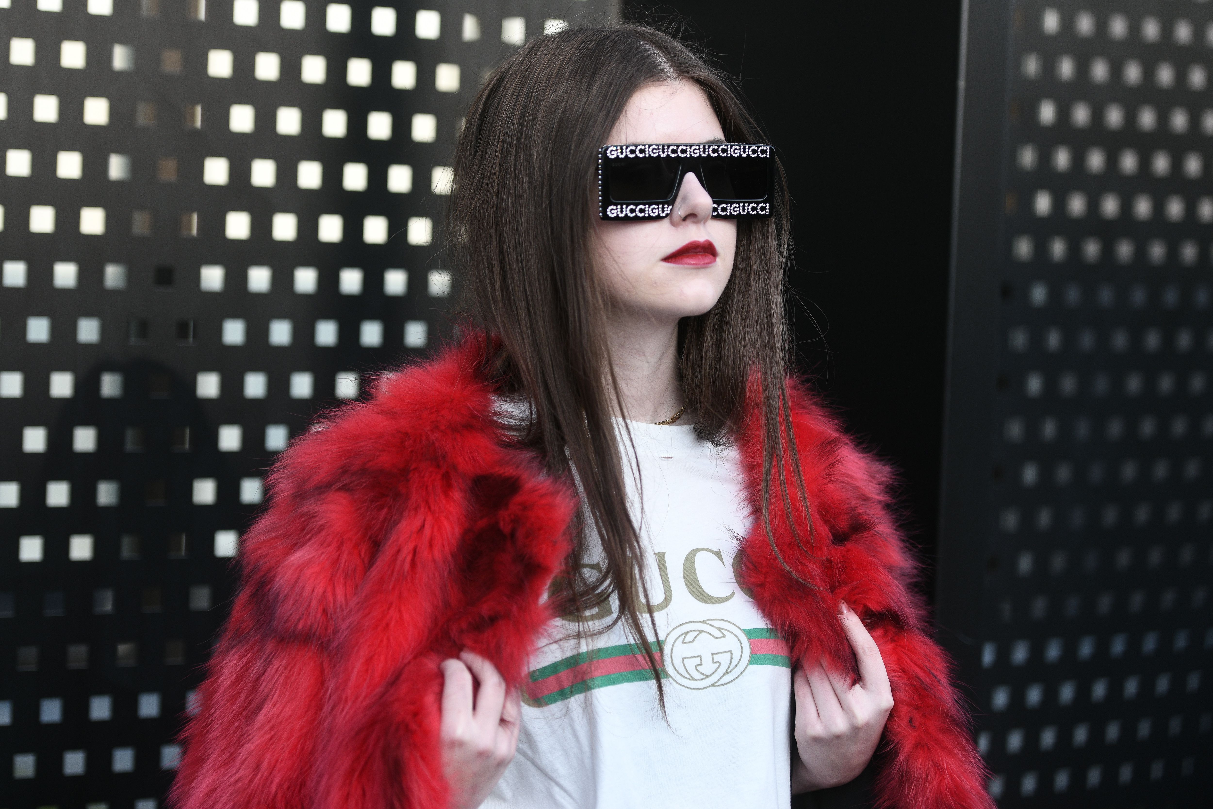 A guest is seen during Milan Fashion week wearing a Gucci top, Gucci sunglasses and a red fur coat.