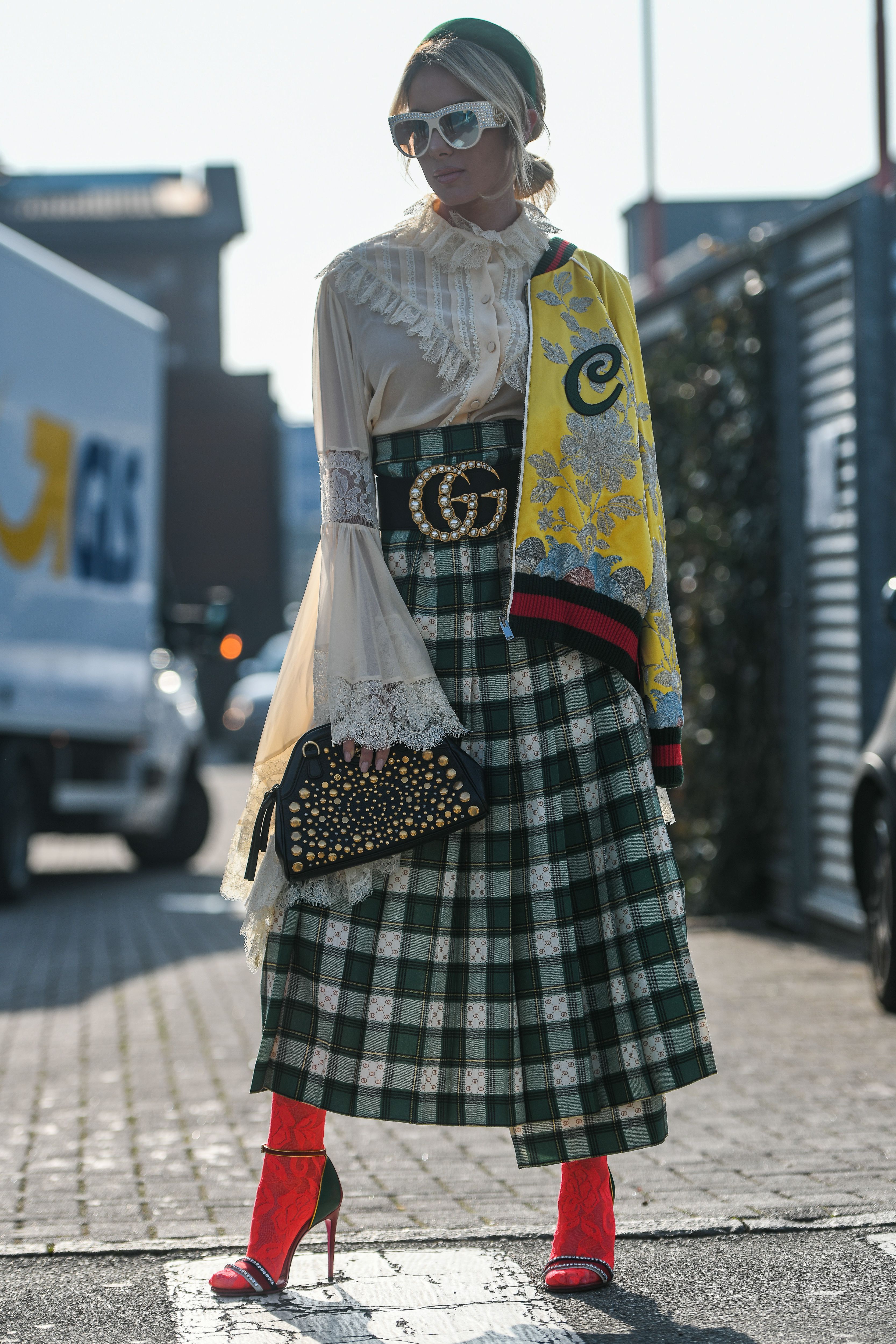 A guest wears a cream blouse, long plaid skirt and Gucci belt outside Milan Fashion Week 2019.