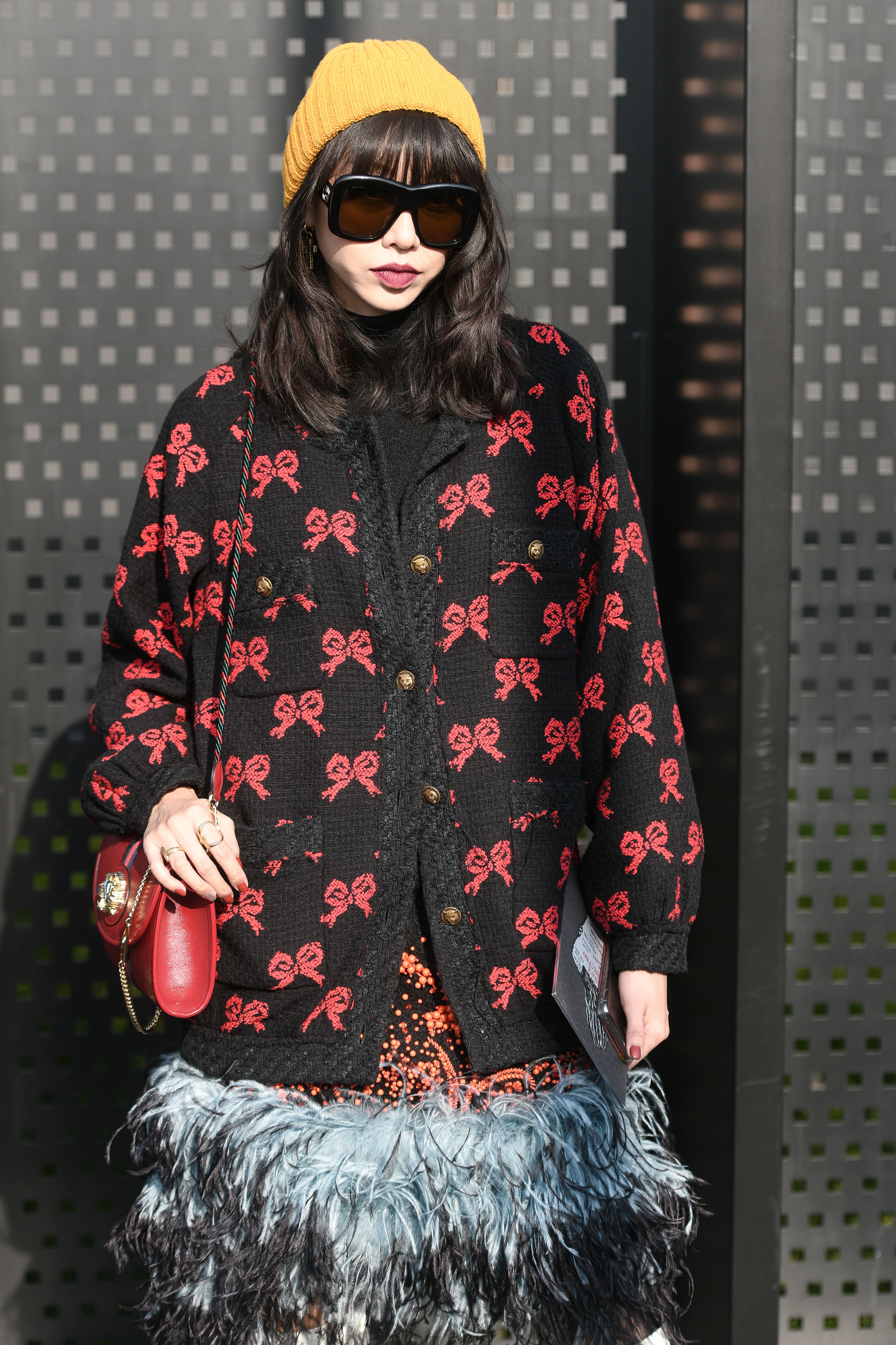 A guest is seen wearing a bow-covered jacket and feathered skirt during Milan FW.