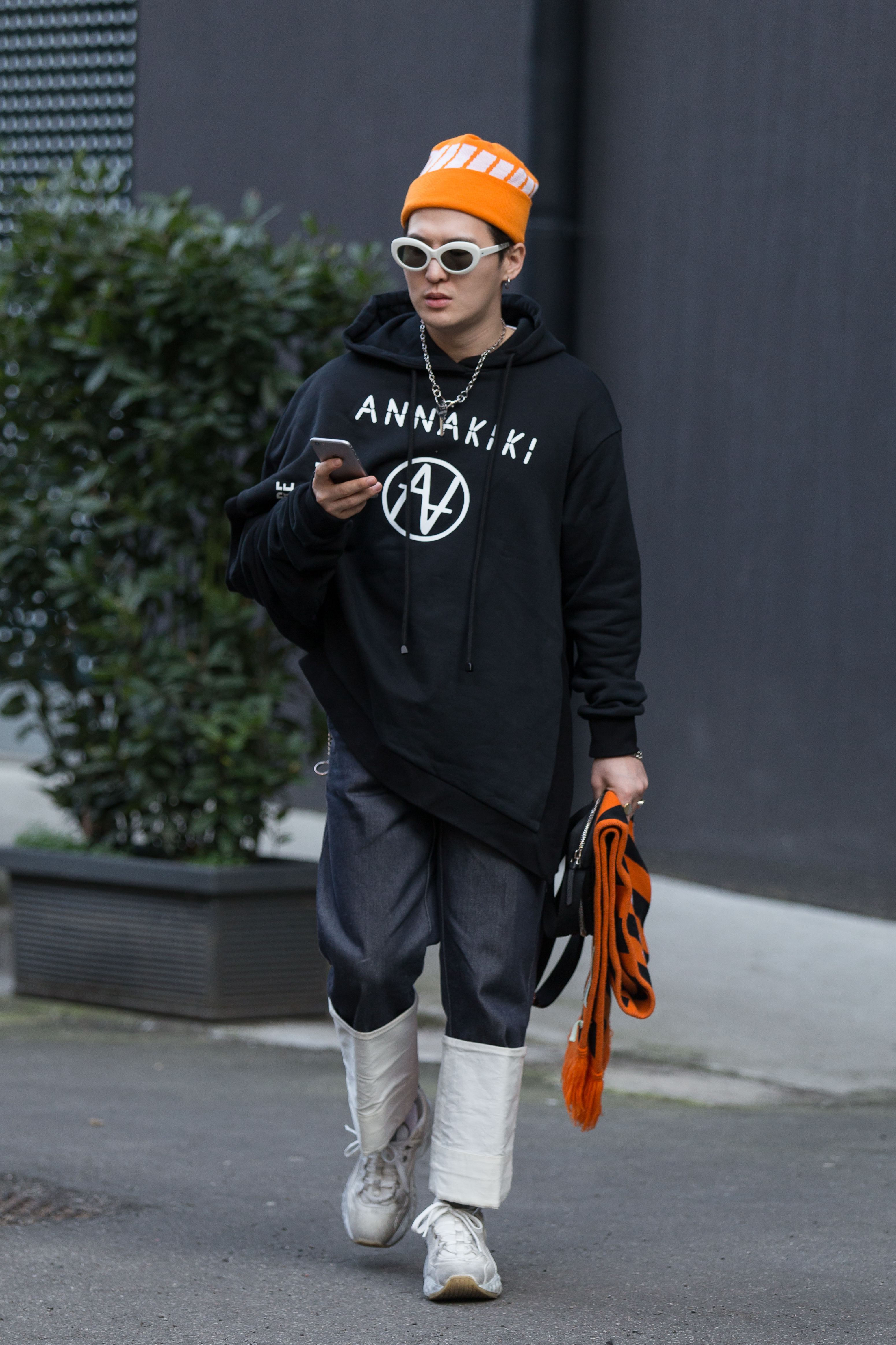 A guest is seen in an Annakiki sweatshirt and orange beanie during Milan FW.