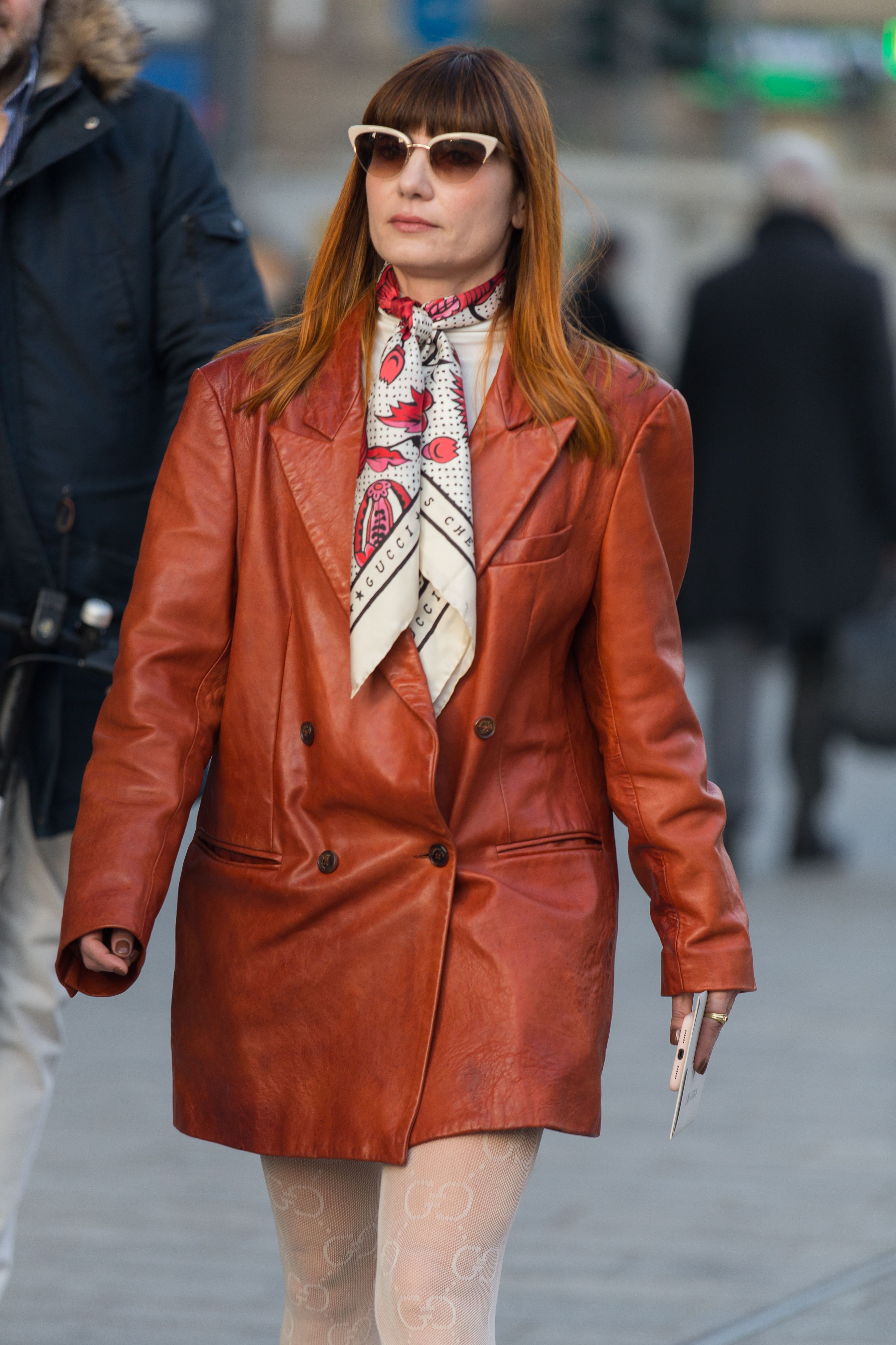 A guest is seen wearing a leather jacket dress and Gucci scarf during Milan Fashion Week.