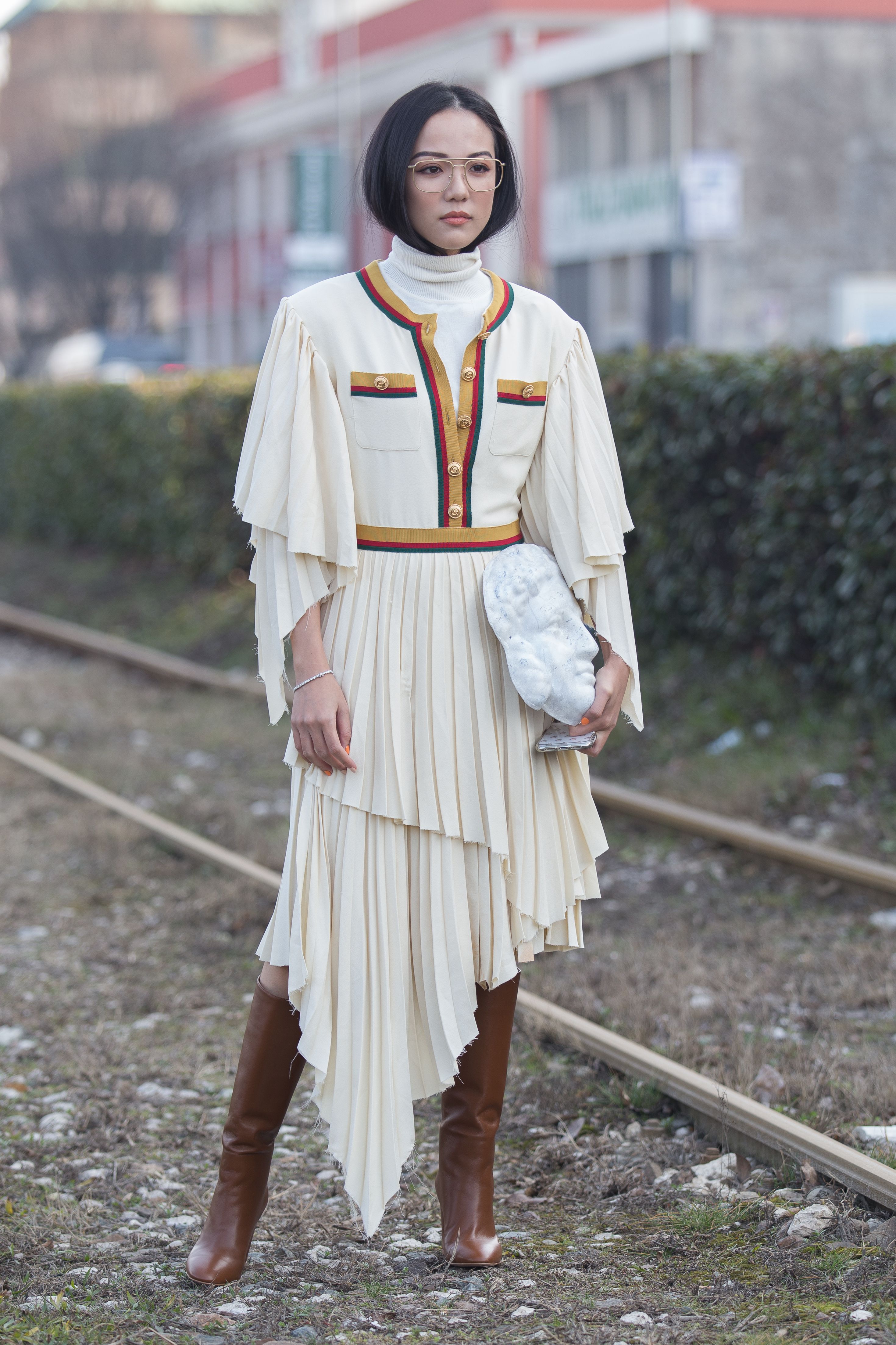 Influencer Yoyo Cao wears a Gucci look outside of Milan Fashion Week 2019.
