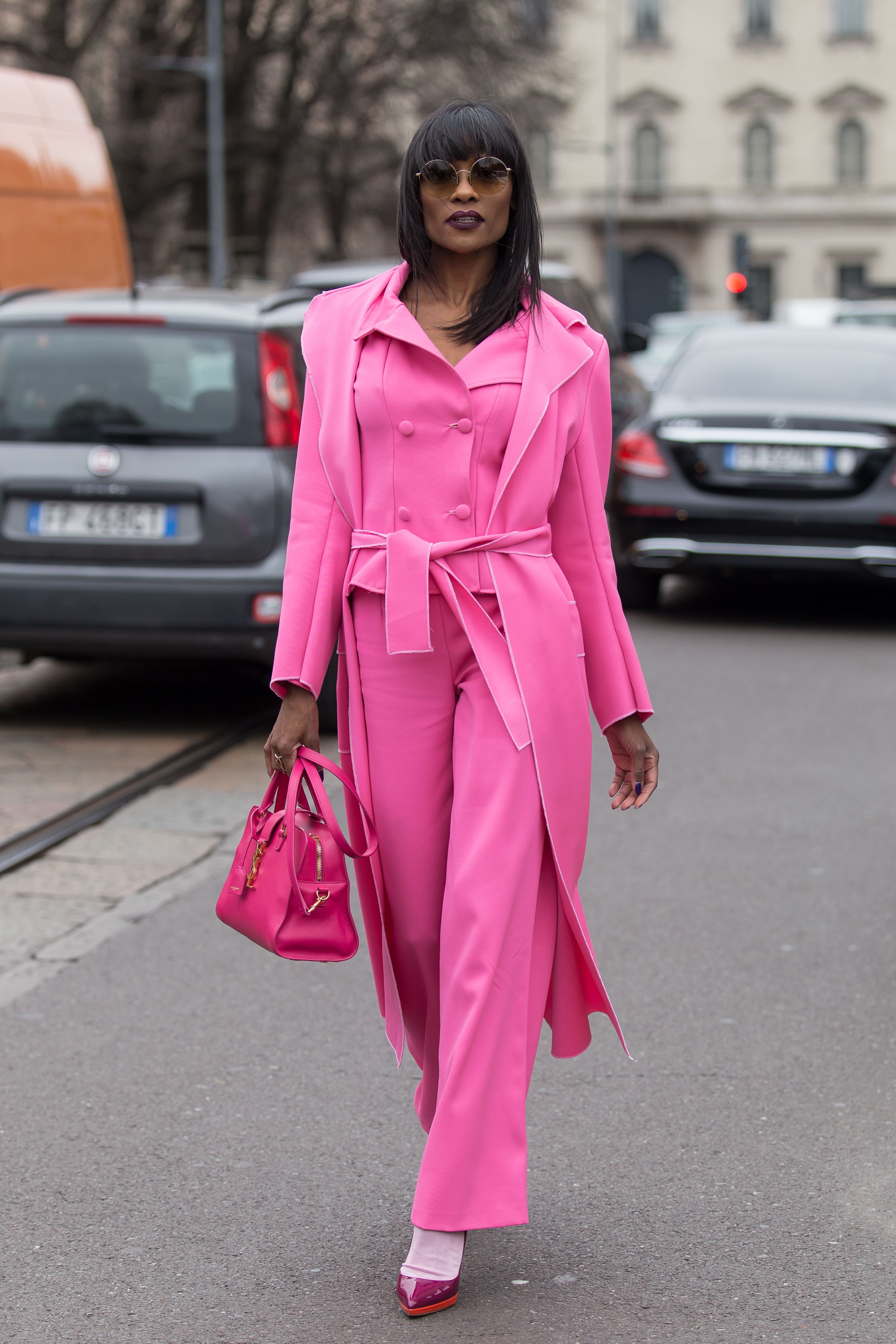 A guest is seen wearing head-to-toe hot pink during Milan Fashion Week 2019.