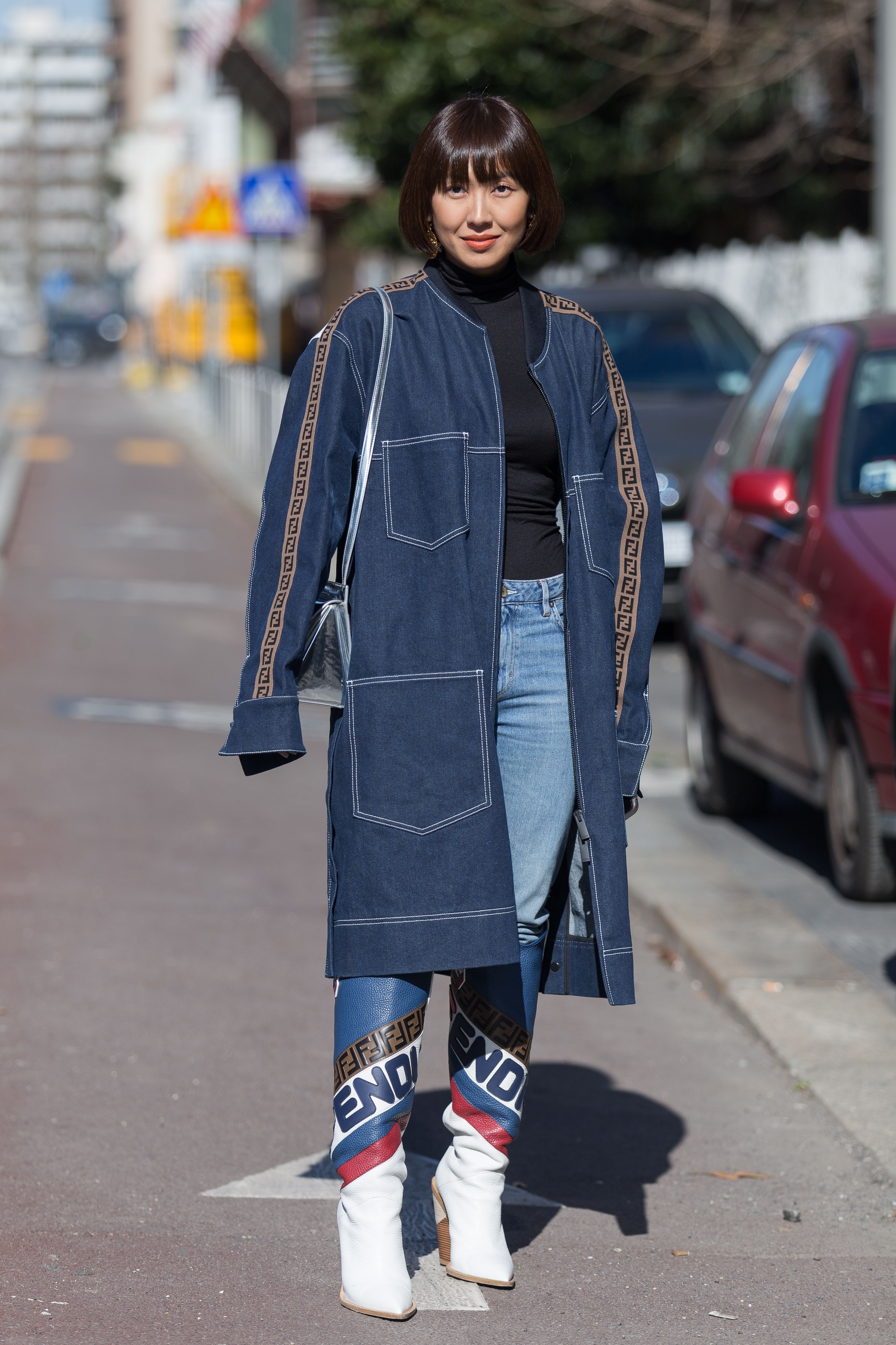 Liz Ui wears Fendi jeans and a long denim jacket during Milan Fashion Week.