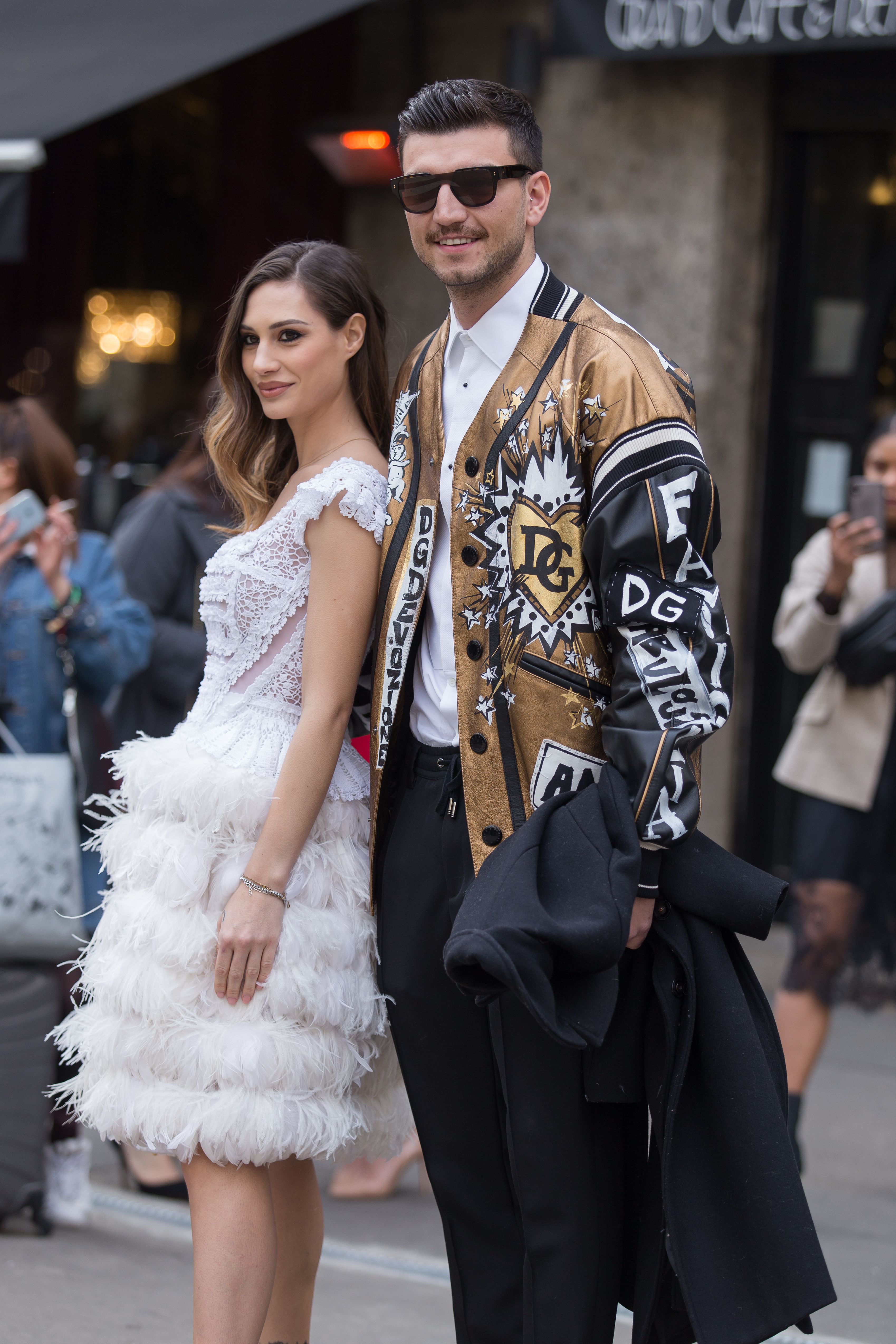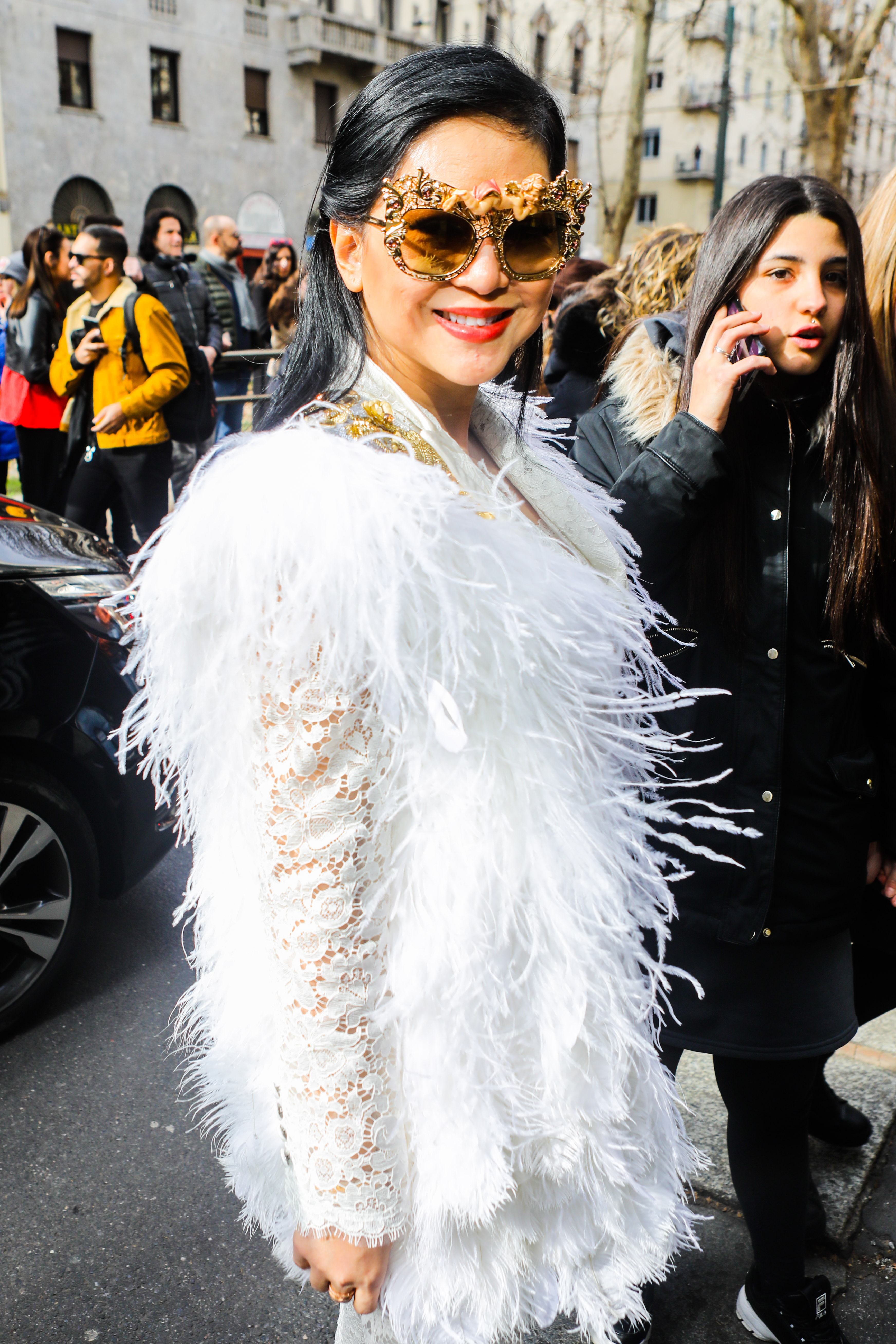 Guest of Milan Fashion Week wear a feathery white dress and a Dolce & Gabbana jacket.