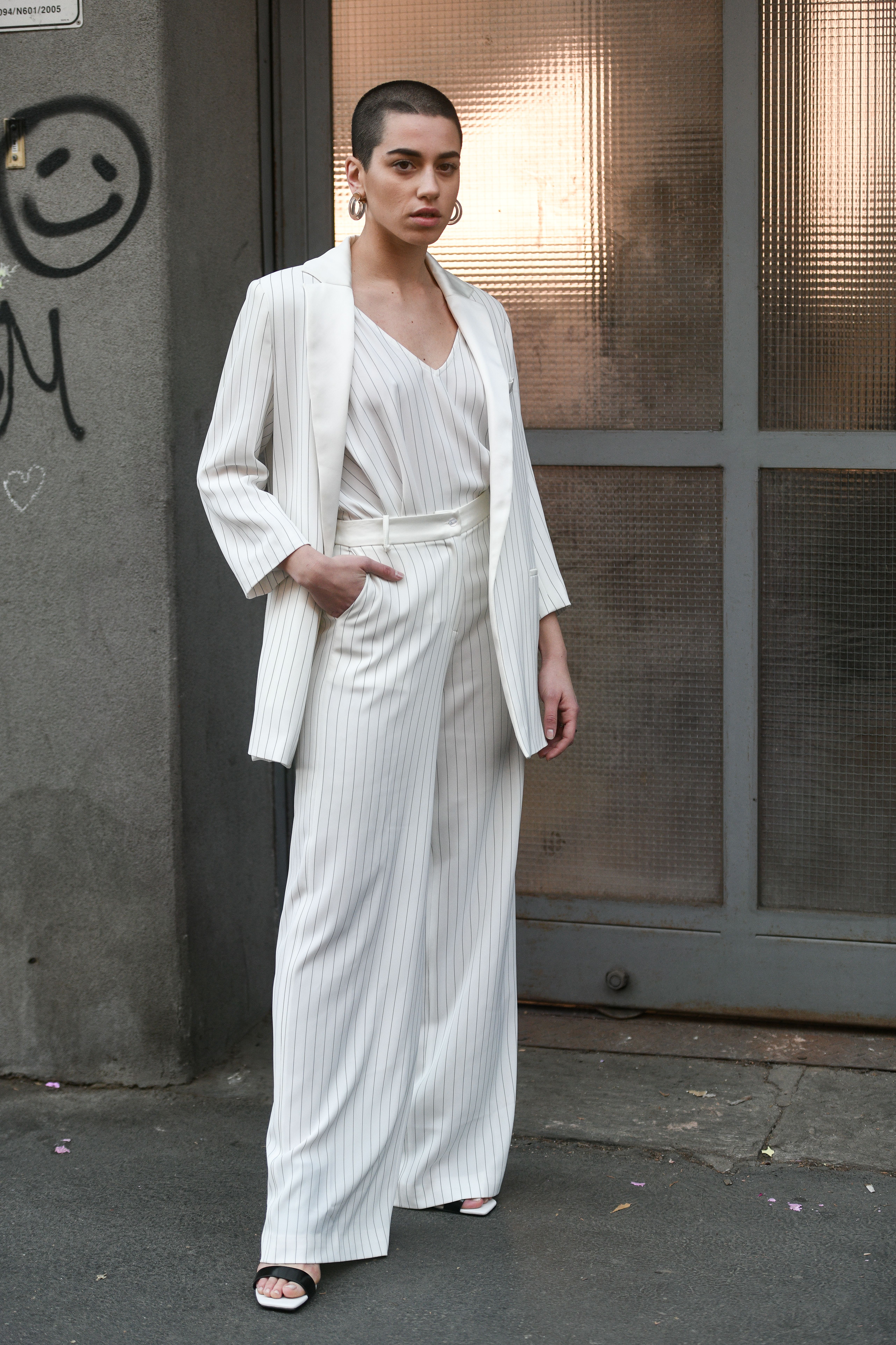 Influencer Lorena Campello is seen wearing a turtleneck and striped suit during Milan Fashion Week.