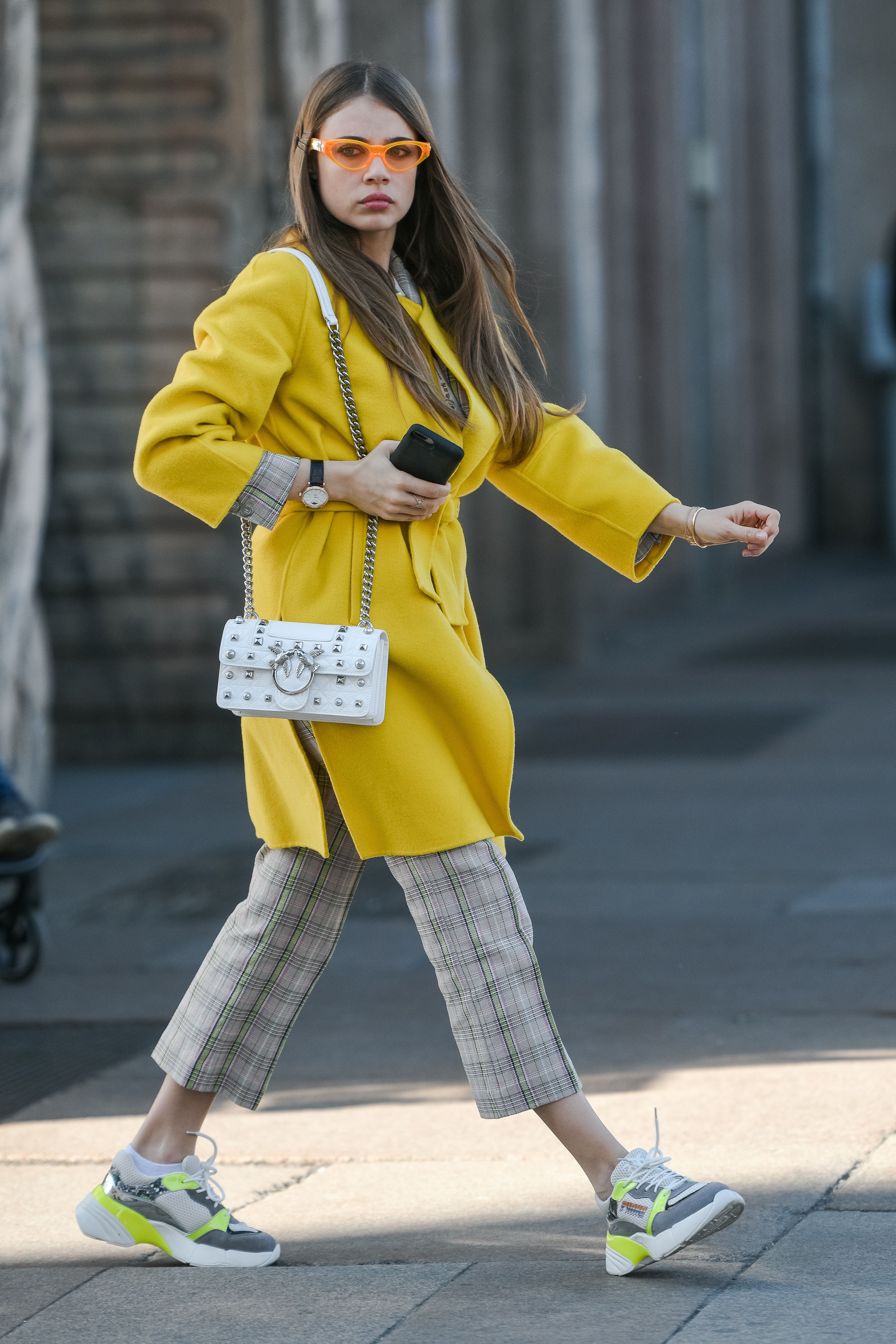 A guest dons a yellow jacket, bright orange sunglasses and sneakers during Milan Fashion Week.