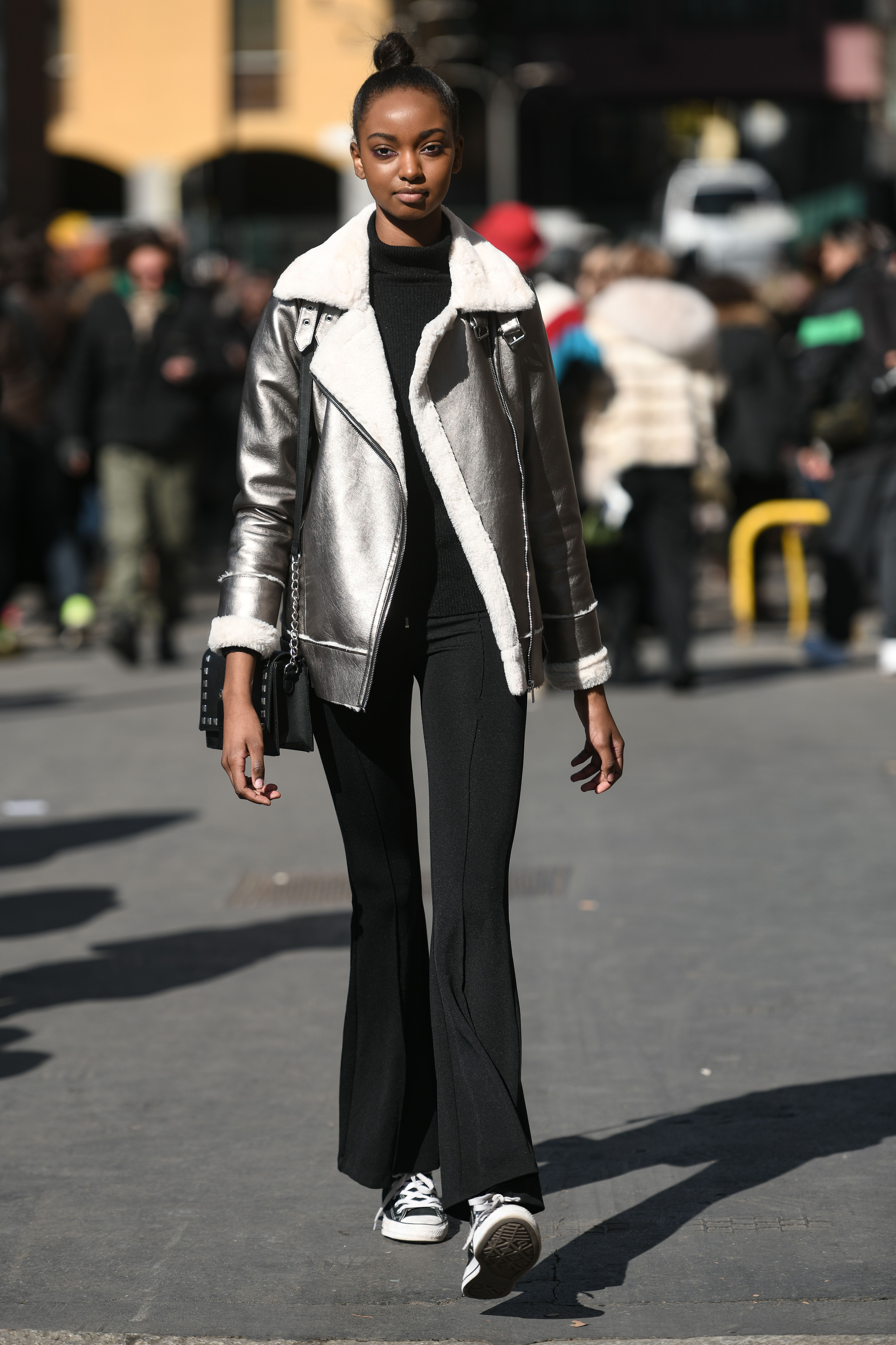 A guest wears a metallic silver jacket and Converse sneakers at Milan Fashion Week.