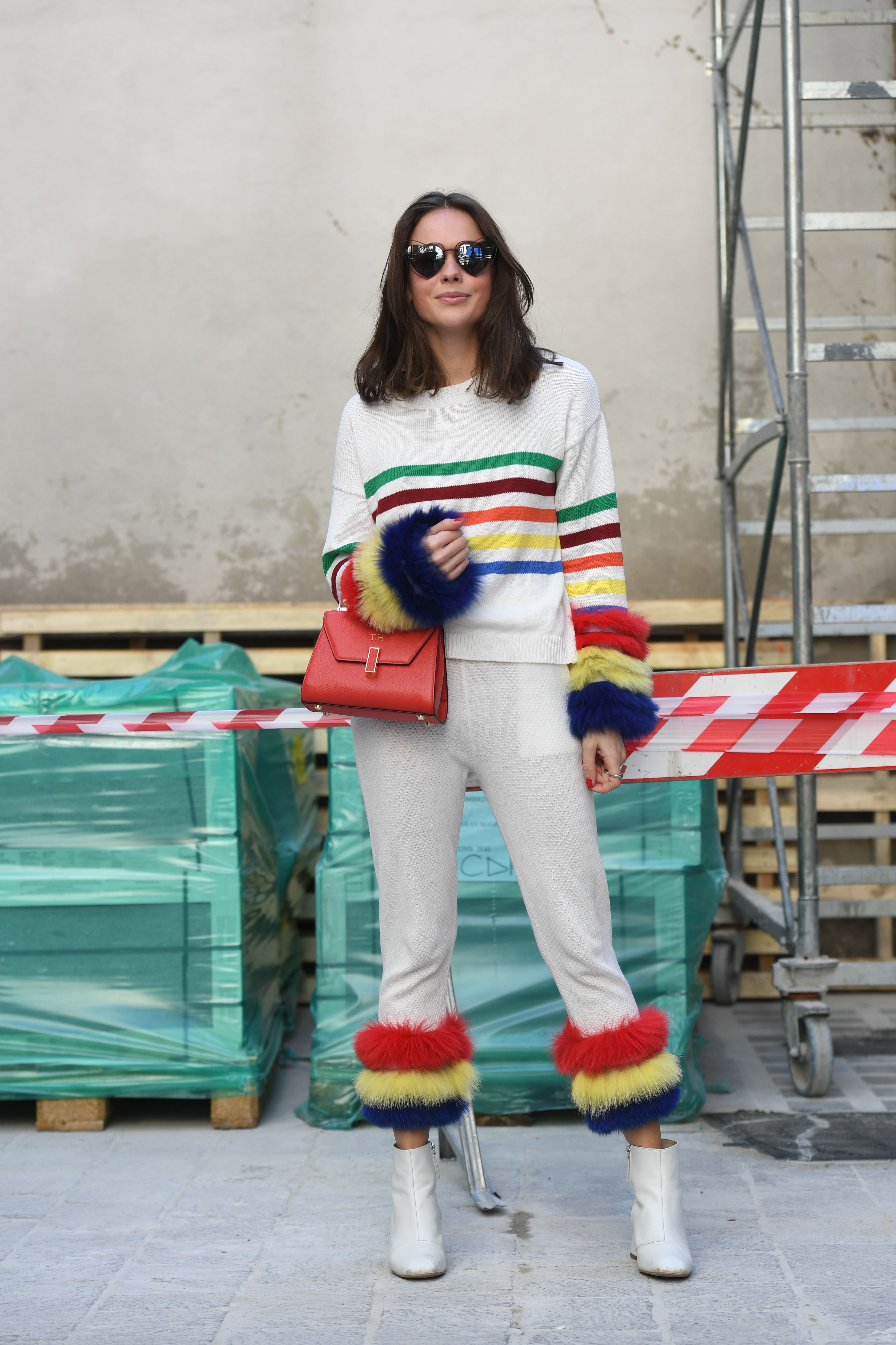 A guest attends Milan Fashion Week wearing a rainbow striped sweater with fur details.