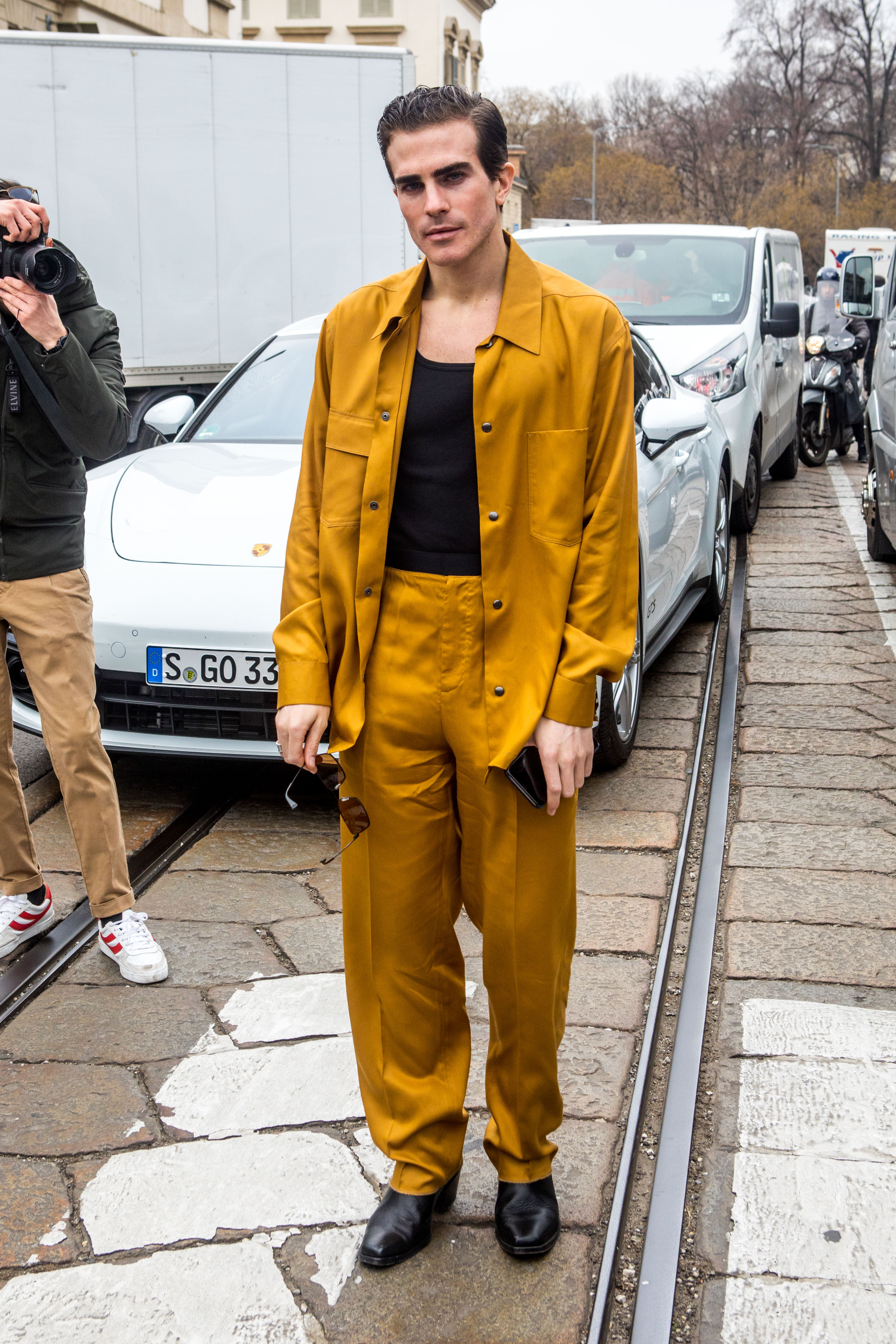 London Socialite Carlo Sestini wears a mustard suit at Milan Fashion Week.