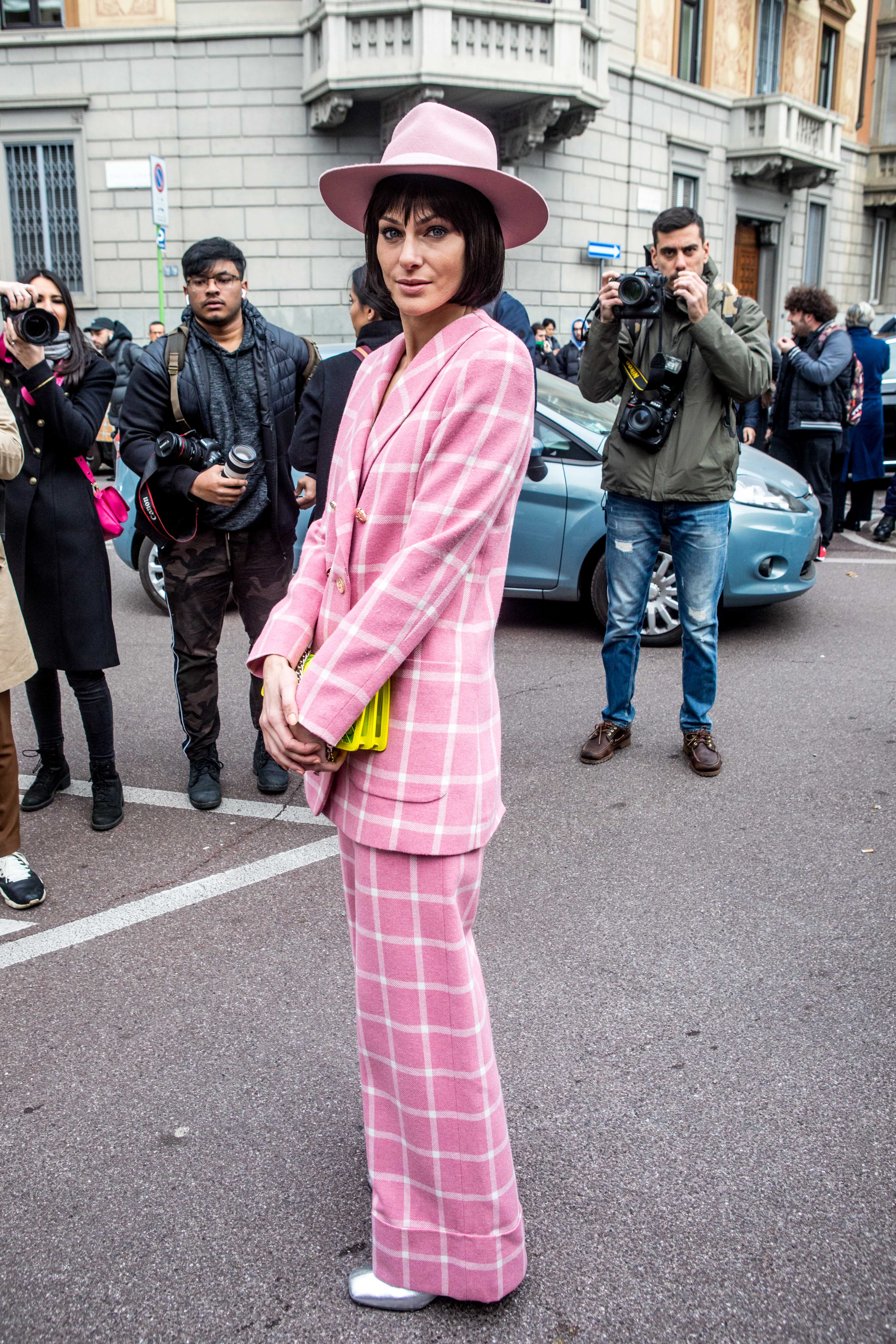 Italian Model Paola Turani wears a pink check suit outside Milan Fashion Week 2019.