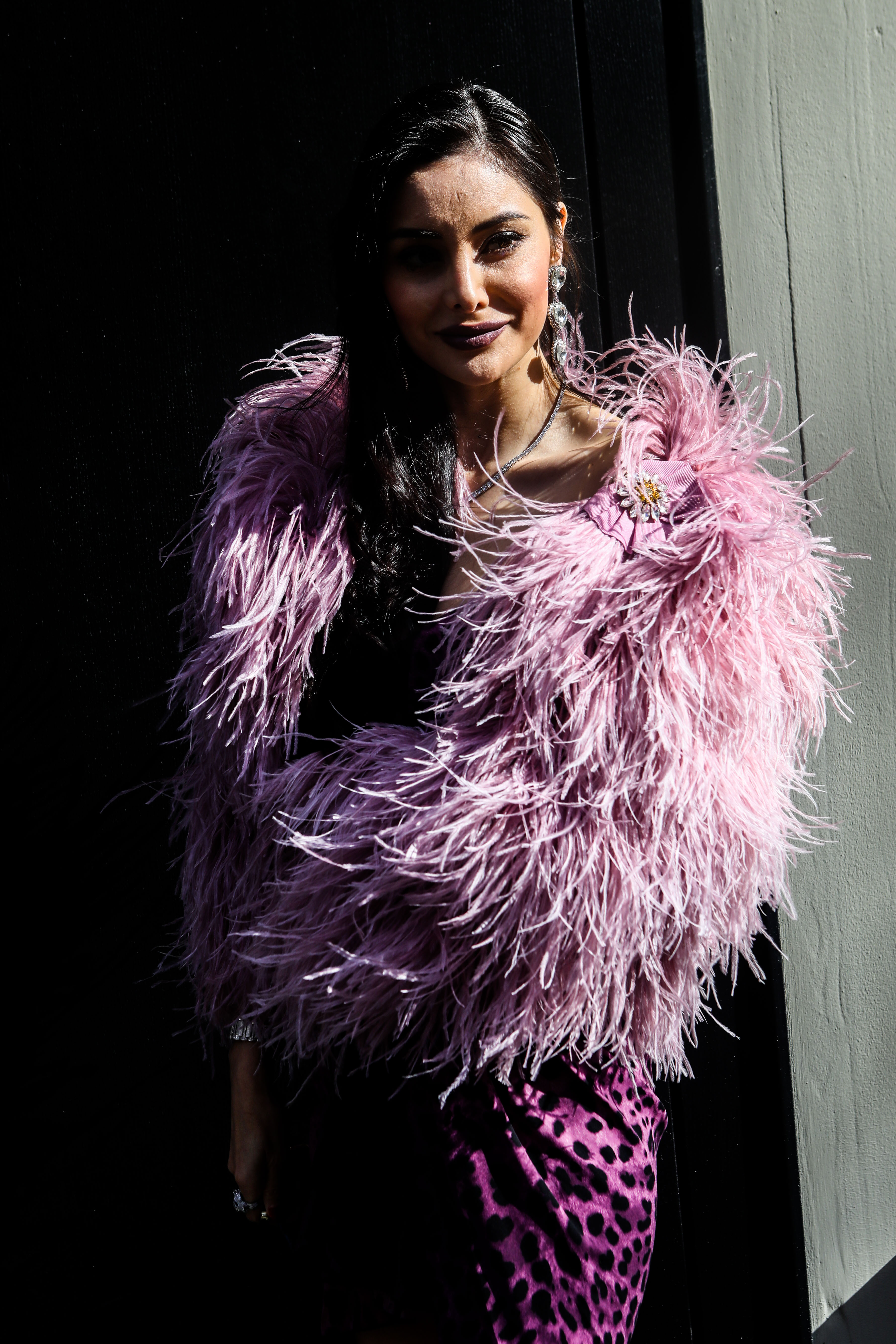 Deborah Valdez attends Milan Fashion Week wearing a feathered pink top.