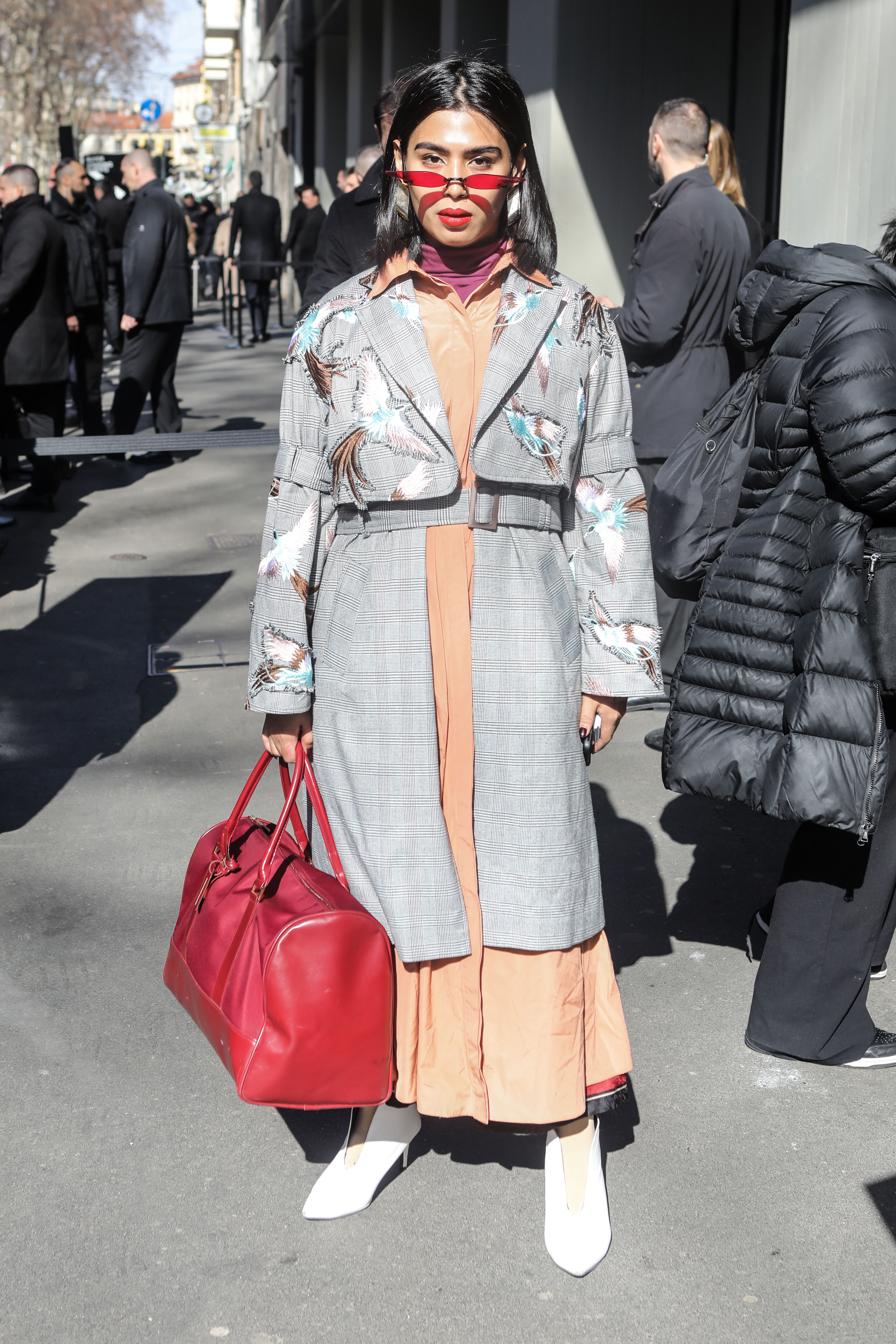 A guest wears a red and gray ensemble outside Milan Fashion Week 2019.