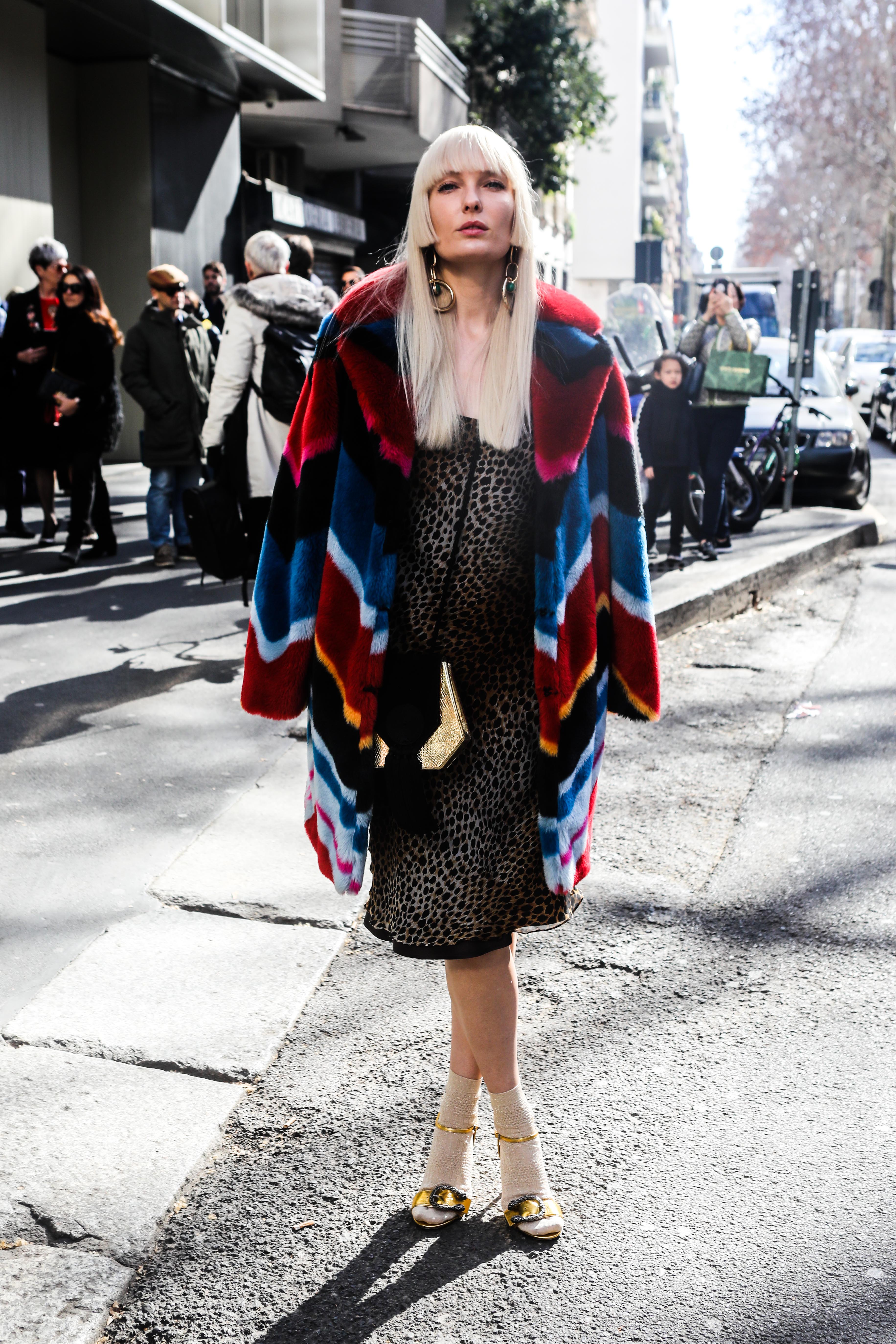A guest wears an animal print dress and colorful striped coat outside Milan Fashion Week.