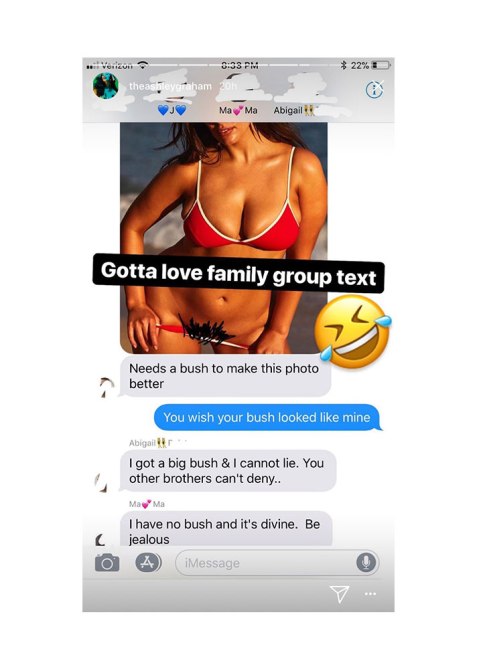 The missing bush wasn’t forgotten in Graham’s family group chat, though. Recently, the model posted a screenshot of the conversation on her Instagram story and it’s the kind of family convo we wish we could have.