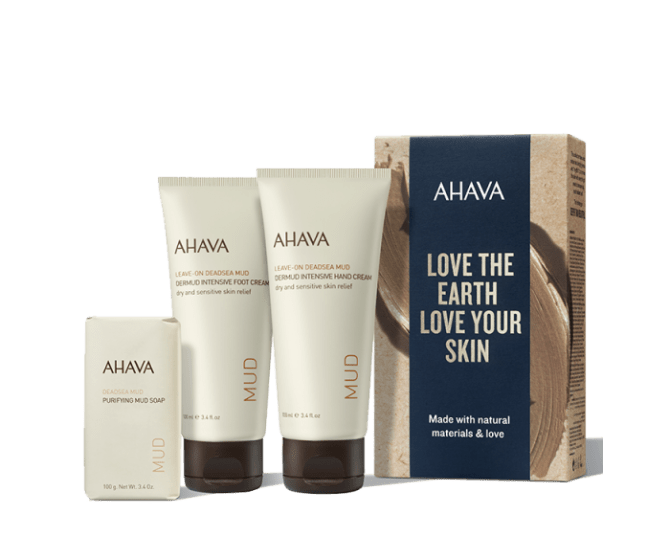A soap, foot cream, and hand cream all formulated with dead sea mud and other natural moisturizers.