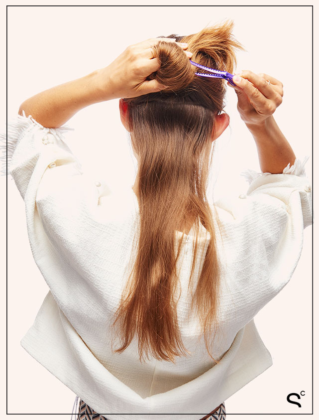 2. Your hair will be separated into three sections: bottom, middle, and top. Start by sectioning off the hair at the nape of your neck (the bottom) from ear to ear. Clip the rest up.