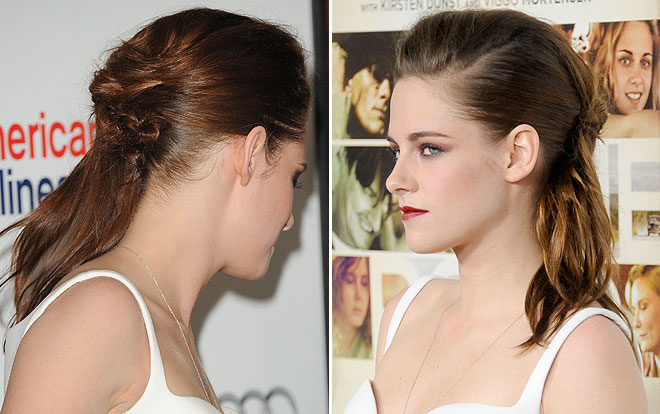 Kristen Stewart sported an asymmetrical ponytail hairstyle at the recent On The Road premiere.