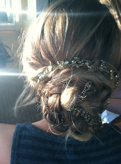 Dove Celebrity Stylist Mark Townsend styled Jennifer’s hair in a seemingly simple chignon, until you looked at it from behind. “I took two Jennifer Behr headbands and braided them into her hair, and then pinned the braid into a bun,” explained Townsend. His expert tip? To ensure the bobby pins hold in place spray them with Dove Refresh+Care Invigorating Dry Shampoo for an extra hold.