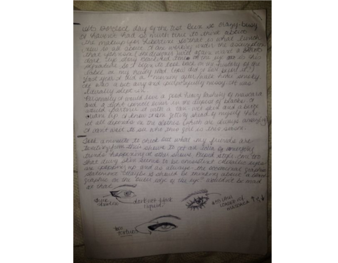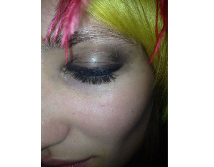 I know in my heart that this has to be about the clothes and the accent offered by the hair. A grand makeup statement here could push the coolness of the girl over the edge. But hey, a makeup test is about trying ideas. I know the label loves a deconstructed black eye so I decide to go for the gusto (go big or go home). I know I have a strong opinion, but let’s start with the biggest idea and deconstruct it from there.