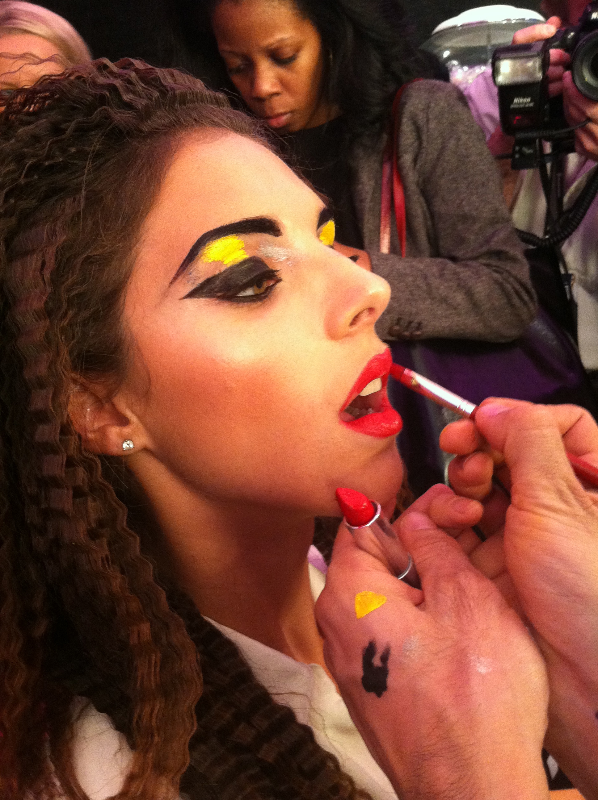 Backstage at Betsey Johnson was a typical full-blown party complete with pink dresses, balloons, and black and pink confetti for an 80’s prom theme. Johnson celebrated her Spring 2013 line as well as her 70th birthday (she must be lying). It was not surprising that makeup artist Gato for Maybelline played with color and created a look that was part pin-up and part comic superhero.