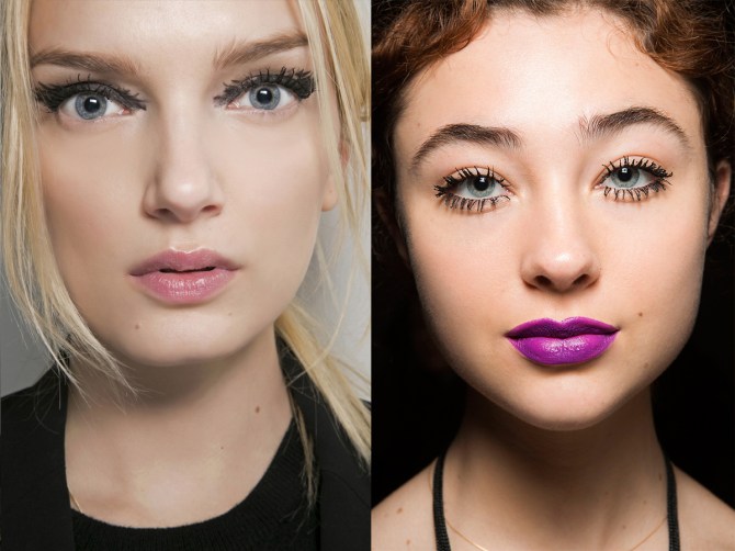 You can always expect deeper lip colors to come in to play once fall hits, but textures and finishes are the wildcard every season. This fall, stained lips in deep berry hues are the look. When decorating a bare glowing complexion the look reads as youthful but sophisticated. The lips at Chalayan (left) were a true stain—juicy in the middle and a soft fade outwards, while the lips at 3.1 Phillip Lim were courtesy of a not-yet-released NARS shade, VIP, applied just the slightest bit imperfectly.