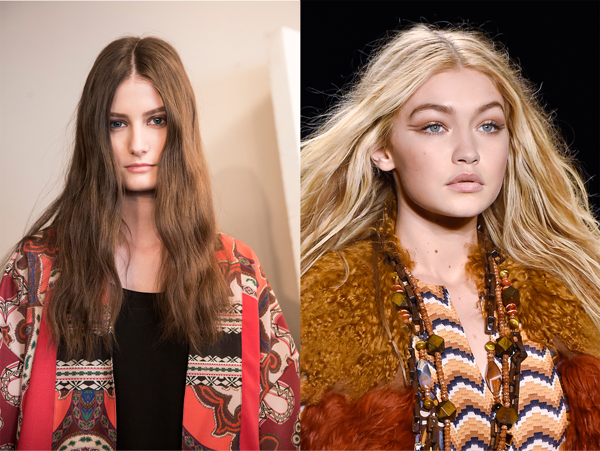 Yes, it’s still happening, long after summer is through. Easy textured hair that’s more soft than it is crunchy will be the fall calling for those with the length to show it off. The big appeal is in the “I woke up like this” attitude and vibe of this hairstyle. It might take a curling wand to get those waves, but once you have them feel free to let them live as recklessly as you dare—they even look better slept on. Etro’s models on the left took it in a bit of a vintage ’70s direction while Anna Sui‘s models on the right wore their waves like wildlings.