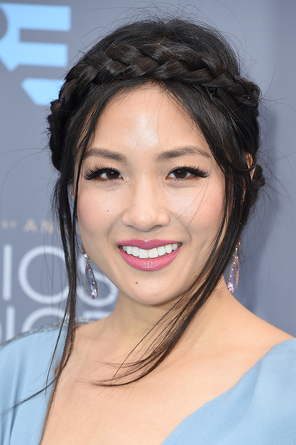 We can’t get over Constance Wu‘s gorgeous, relaxed crown braid and glistening pink lipstick.