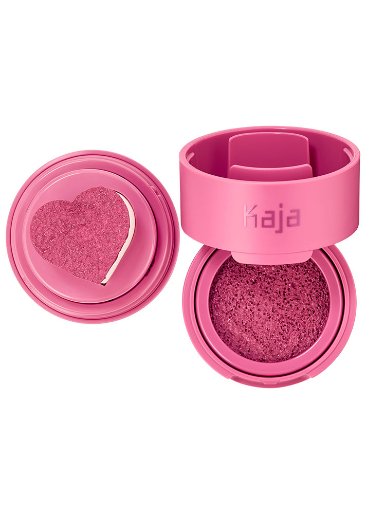 The cushion, heart-shaped applicator transfers a light flush of color that can be blended out into a sheer finish.