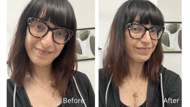 In the photo above, the left photo is me wearing just the serum and moisturizer, and the photo to the right is after I apply the tinted serum. It’s definitely on the more subtle side of coverage—think very light and very natural. So if you need to cover up blemishes or any kind of discoloration (or are looking for a more high-coverage look), I’d recommend using a foundation as a fourth step. But for an everyday, your-skin-but-better finish, The Tinted Serum is perfect.