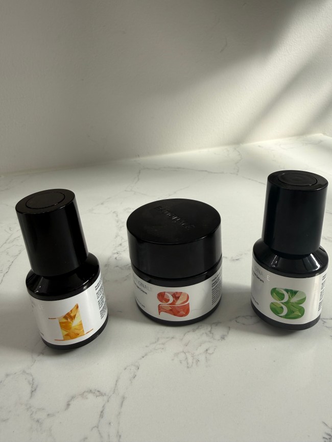 This skincare set comes with three products: The Serum (step one), which hydrates skin. This part is really important because Tretinoin can be drying; The Light Creme (step two), which is a vitamin C-infused moisturizer that helps with brightness and giving you that healthy, glow-y IRL filter; and The Tinted Serum (step three), which is a lightly tinted serum with SPF 50 that gives you a bit of coverage while keeping skin protected from UV rays. All formulas feel incredibly luxe and have a light, citrus-y fragrance.