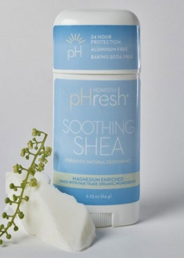 Instead of aluminum or baking soda, Honestly pHresh’s prebiotic line relies on essential oils and prebiotics to fight body odor. The shea version also features cocoa butter, coconut oil and vitamin E.