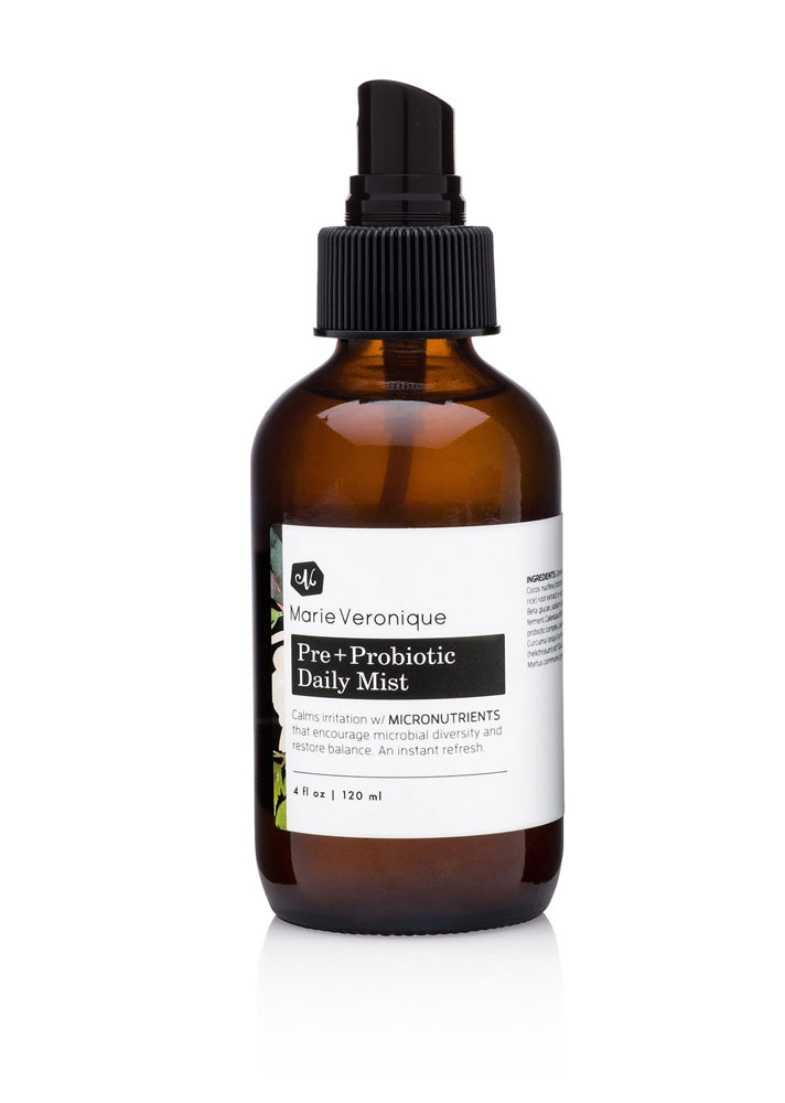 Packed with a proprietary formula of prebiotics (like galactooligosaccharides) and probiotics. Marie Veronique’s mist is best absorbed after cleansing for calm and soft skin.