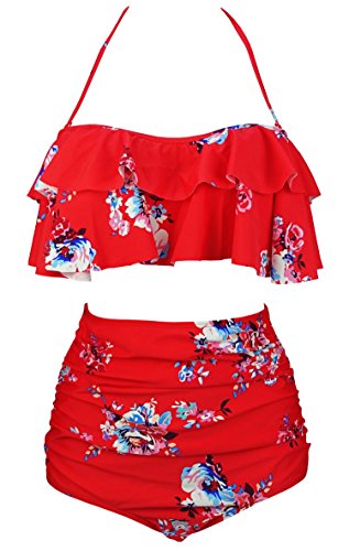 This fun floral bikini from COCOSHIP’s goal is to emphasize your curves while glossing over other areas. The high-waisted bottoms are ruched to be extra flattering. The flowing top with built-in padding gives you cute coverage and support while looking a little flirty. The halter strap can be adjusted to fit your shoulders or taken off entirely if you want to go strapless while sunbathing. This boho suit comes in a variety of colors and patterns. You can choose from 20 suits.
