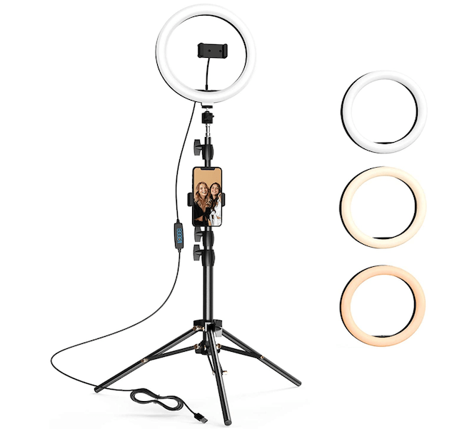 This ten-inch LED ring light tripod features a wide range of settings to allow you to customize the effects, including ten different adjustable brightness levels and three color settings, ranging from warm to more cool tones.