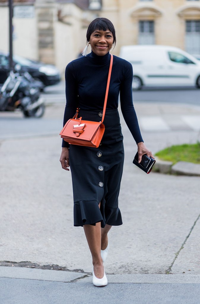 The miniskirt or dress is all about legs for days. Play up yours with a pump or a shoe that doesn’t “cut off” your foot or leg. That means avoiding chunky ankle or calf boots and looking for shoes that keep the attention on the mini. A pump or over-the-knee boots are a great option for keeping your legs looking long.