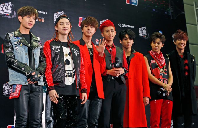 At the 30th annual Golden Disk Awards in January 2016, BTS’ hair colors had changed again. Jimin’s hair was now orange, while RM and Suga had brighter and brassier blonde locks than they did before.