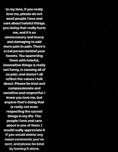 To my fans, if you really love me, please do not send people I love and care about hateful things. You doing that really hurts me, and it’s so unnecessary and heavy and damaging to add more pain to pain. There’s a real person behind your tweets. You spamming them with hateful, insensitive things is really not funny, is causing all of us pain, and doesn’t at all reflect the values I talk about.