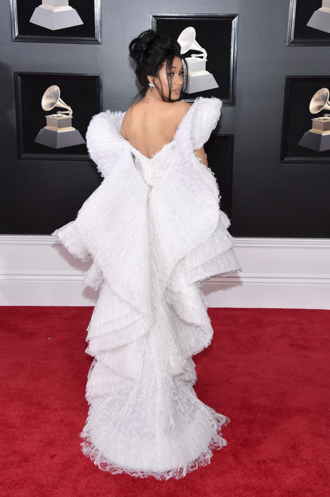 Despite the loss last year, she definitely took home the award for one of the Best Dressed. Cardi B looked absolutely unreal in her custom creation by designer Mohammed Ashi at the 2018 Grammys. First the front: