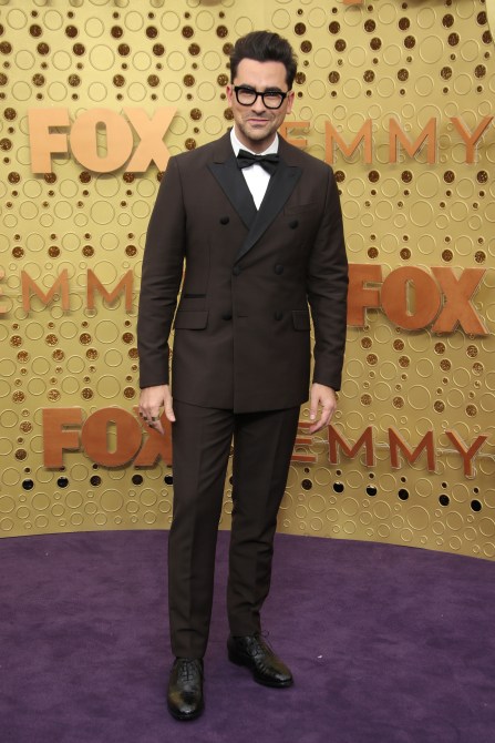The Home Alone and Schitt’s Creek alum was definitely giving us ’60s vibes with this black and white blocked number. She’s also nominated tonight for her work on Schitt’s Creek.