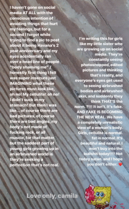 I haven’t gone on social media AT ALL with the conscious intention of avoiding things that hurt my feelings, but for a second I forgot while trying to find a pic to post about it being Havana’s 2 year anniversary and my eyes accidentally ran over a headline of people body shaming me. Honestly first thing I felt was super insecure just IMAGINING what these pictures must look like, oh no! My cellulite! Oh no! I didn’t suck in my stomach! But then I was like… of course there are bad pictures, of course there are bad angles, my body’s not made of fucking rock, or all muscle, for that matter, but the saddest part of young girls growing up in an airbrushed world is they’re seeking a perfection that’s not real.”