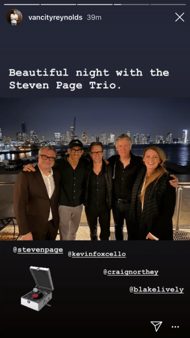 The parents of three enjoyed an evening out and saw the Steven Page Trio play at City Vineyard in TriBeCa. Reynolds shared a photo on his Instagram story with the band after the show. “Beautiful night with the Steven Page Trio,” the Deadpool actor wrote below the photo. The shot was taken outside with the river behind them. Prime local for a photo-op. Although…were they cold? Cause like, NYC is entering winter at the moment and it was anything but warm last night. Lively was the most bundled—with a black coat and striped scarf, so we’re guessing she could stand the chill. Still tho…that close to the water? It gets v windy. Lively’s long blonde hair seem to blowing in the breeze.
