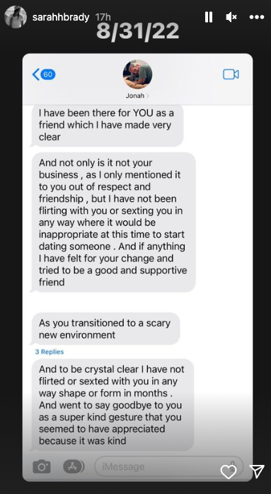 When Brady screenshot an NFSW text to send back to him, he replied: “Screenshotting intimate texts between us is a huge triggering violation for me and breach of trust as a friend as I have explained to you about breaches of trust I have had between trusted friends recently that have caused me trauma. I am incredibly hurt and feel a lack of safety where I have always trusted you.”