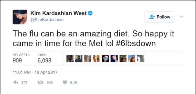 Kim Kardashian, in what we would like to think was a temporary lapse of sanity, posted the following late last night on Twitter: “The flu can be an amazing diet. So happy it came in time for the Met lol #6lbsdown.”