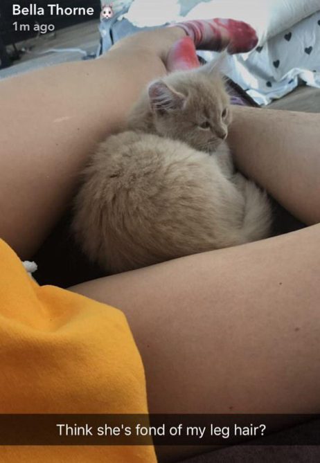 Leg hair, don’t care! Bella Thorne apparently thinks so (us too!), as evidenced by an adorable clip of her cat snuggling into her unshaven legs yesterday on Snapchat. Side note: Leg hair and a cat? The 19-year-old is basically living our Sundays.